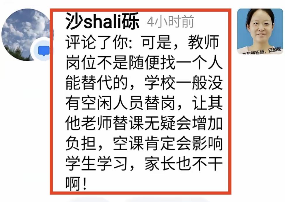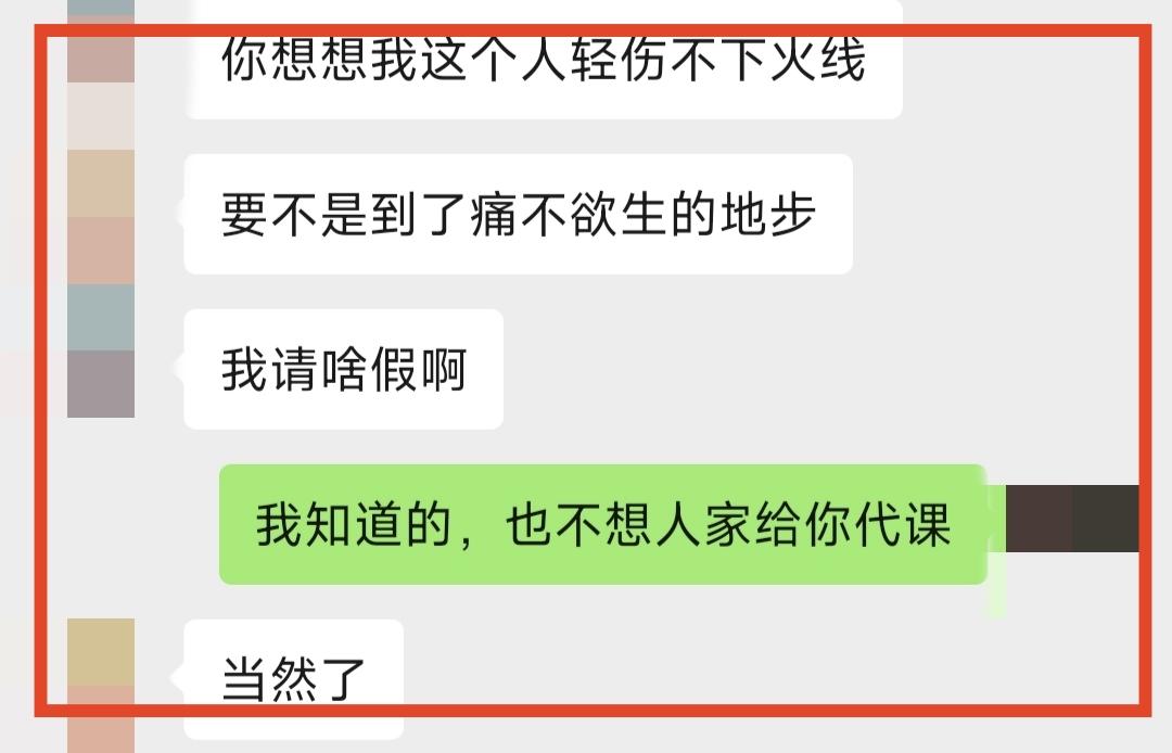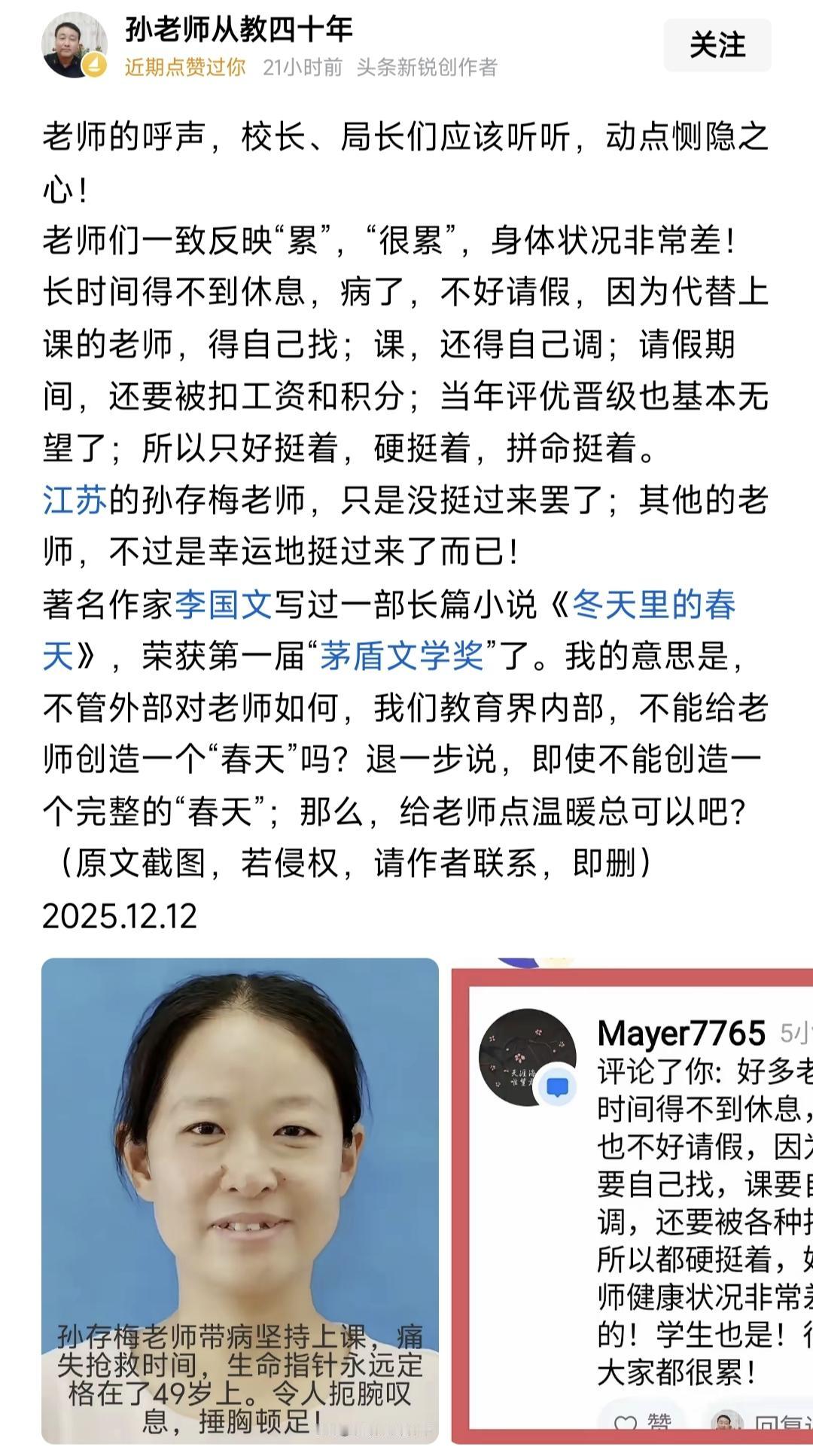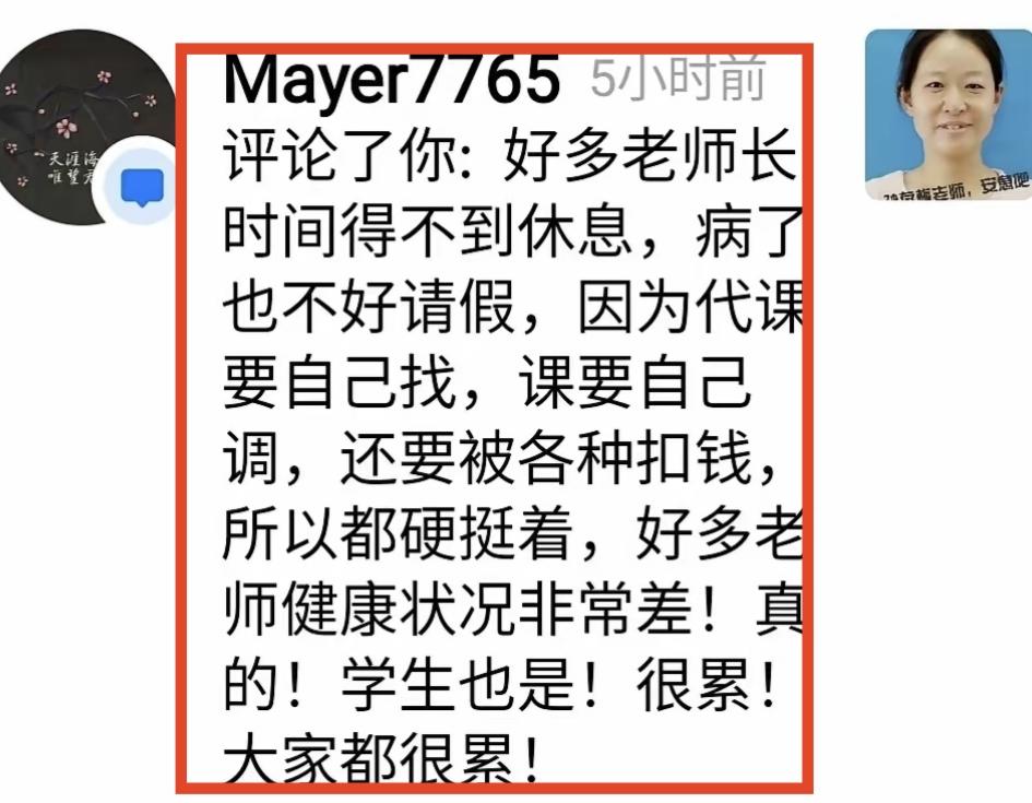 这个老师的微信留言会戳痛多少人的心?49岁,她离开了,离开之前她长期带病上课。今天我从孙老师从教40年的微头条中,看到这位老师在微信跟朋友聊天的留言,内心真的很痛。老师生病住院,凡是要求老师自己找代课老师,自己调课,自己解决一切问题的学校,简直毫无人性。有人性的做法是,老师有病立刻让老师去看病,由学校和学校领导解决一切问题,让老师不要操心学校和学生,安心看病。如果学校领导连这一点都做不到,我们还要他们干什么,我们要学校领导要那么多中层干部,不就是为老师解决后顾之忧,让老师安心教学吗?你们说调课很难,代课很难,如果因为难,就让老师自己去解决,那配不上领这份工资。 我还是那句话,教书不是教师生活的全部,学生不是就是生命的全部,老师如果生病了一定不要坚持,就算天塌下来也要去看病,因为只有身体是你自己的,你的背后还有家人,而不仅仅是学生。 教育局领导更要关注这个问题,如果老师生病了住院了,除了让其他老师代课,还有没有其他更好的办法?人在其位就要谋其政,有担当,更要有一颗善良的心,是自己的事情,就不要推给一线老师。教育