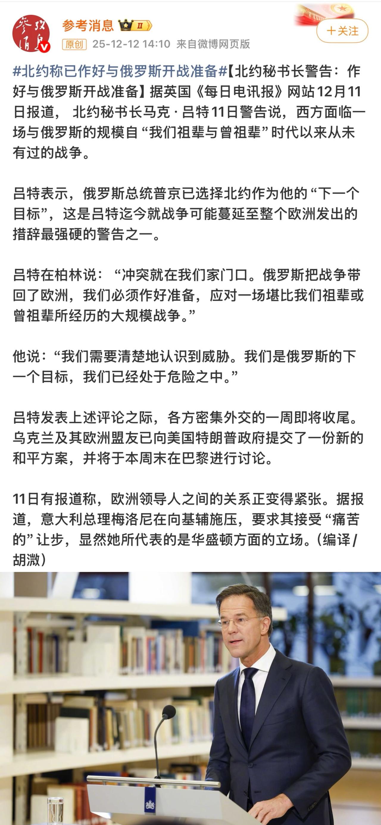 北约秘书长发出史上最强硬警告,称西方必须为应对俄罗斯可能引发的、规模堪比祖辈时代的史诗级战争做好全面准备。 俄罗斯官方多次公开表示无意与北约或欧盟开战,但其立场是明确且连贯的:不主动寻求冲突,但已为应对西方的任何侵略行为做好全面准备。