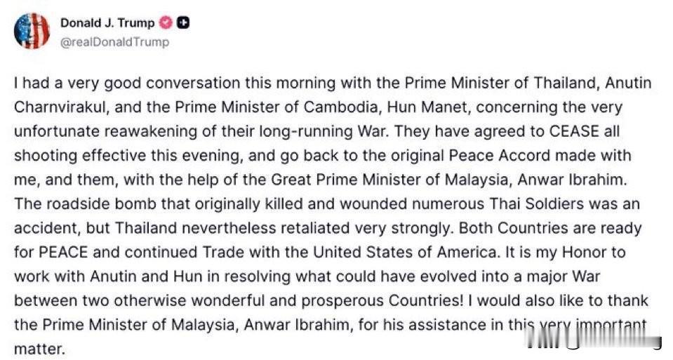 特朗普宣称促成泰柬边境停火协议,称两国同意停止边境枪击 特朗普发文表示,其与泰国总理阿努廷·查恩维拉库尔、柬埔寨首相洪玛奈进行了“十分愉快”的晨间会谈,双方达成协议,决定“自今晚起停止所有枪击行为”,并恢复此前由其斡旋、马来西亚总理安瓦尔·易卜拉欣协助达成的和平协议。 特朗普称,导致泰国士兵伤亡的路边炸弹事件属“意外”,泰国随后采取了强硬反击。他还表示,两国目前均渴望和平,愿继续与美国开展贸易,避免这两个“繁荣”邻国爆发“大规模战争”。 此前,持续数日的致命冲突破坏了特朗普此前促成的停火协议,造成数十人死亡、数十万人流离失所。不过泰国总理尚未确认协议签署事宜,其指出特朗普虽敦促各方保持冷静,但要求柬埔寨先行采取行动。若此次停火能够持续,将为该地区带来极大缓解;若失败,局势恐再度陷入混乱。