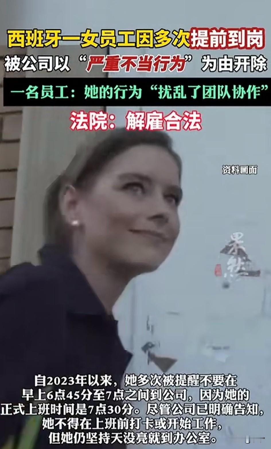 西班牙一女员工, 因为多次提前到岗, 被公司以)严重不当行为”为由开除, 女子表示不服, 她的同事也不帮她说话, 表示她一个人的行为影响了团队协作, 据悉该女子已被多次警告, 要在6:45~7点之间打卡, 为他们的快递公司是7点半上班, 该女子提前到达快递公司, 这让他的主管感到不安, 最后忍无可忍将她开除, 女子不服将快递公司告到法院, 法院了解到情况后表示开除合理, 依据西班牙工人法典确认公司开除合理,不用支付任何补偿, 女子非常的生气, 这在国内妥妥是劳模员工, 在西班牙却不合法, 怪不得这么多人想去欧洲工作, 原来那里是反对内卷的, 就算是普通的快递工作也不行, 国内的快递公司一般都是6点到岗, 6点半就开始上班了, 如果迟到很有可能当天的工资扣一半, 大家觉得这样的劳模员工被西班牙快递公司开除合理吗? 快递员那些事 西班牙印象 单方面辞退员工 解雇规定 西班牙劳动法 合法开除员工