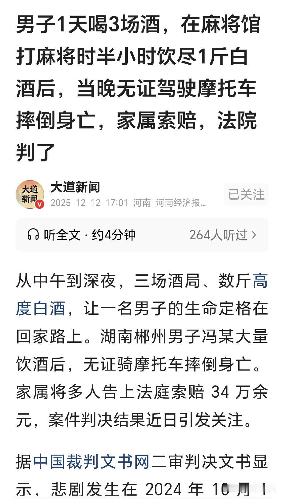 有枣没枣打一杆子!湖南郴州,一男子中午赴宴,喝下4两白酒,下午6点,他又约了朋友,4个人分了2斤白酒,晚上9点,男子到麻将馆打牌,一牌友赶来见面,花100元叫人帮买了2瓶二锅头,随后二人高兴,半小时喝完两瓶白酒,随后男子骑摩托回家,万万没有想到,刚开出200米就摔倒死亡,家属将牌友,麻将馆老板和帮买酒者告到法院,索赔 34 万,法院判了! 2024 年 10 月 1 日,一户人家办白事宴席,冯某接到了邀请,他早早出发,到了上午11点左右,他赶到了到瑶岗仙五郎坪的赵家。 赵家人热情好客,感谢各位亲朋好友前来帮忙,宴席上高朋满座,大家一边品尝着菜肴,一边举杯互道辛苦。 宴席上摆着高度的白酒,大家难得聚在一起,朋友们推杯换盏,气氛热闹,冯某一高兴,一口气喝下4两白酒。 按照一般人的酒量,4两酒早就已经上头,可冯某的酒量非同可小,他爱喝酒,4两酒对他来说,根本就是小菜一碟。 宴席过后,本该回家好好休息,可冯某压根就满不在乎。 下午6点,冯某又和邓某、邹某、欧某约好吃饭,他马不停蹄,赶到瑶岗仙陈家村一家饭店。 四人见面,互道寒暄,他们一边吃饭,一边又要了两瓶白酒。 不知不觉,美餐吃完,2瓶酒也喝的见底,四个人吃完喝完,结账后拱手道别,冯某已经喝得有些晕晕乎乎, 晚上7点50分,他离开饭店,径直走进麻将馆里,老板肖某兰热情好客,立刻给他安排了座位。 冯某坐下后打起了麻将,他意兴阑珊,一口气打到晚上9点。 这时李某也来到了麻将馆内,他和冯某是很好的牌友,他看到冯某在打牌,立刻凑了搭话,两人见面,一拍即合,立刻嚷嚷着又要喝酒。 冯某掏出100块钱,递给在一旁闲着刘某,要刘某帮忙出去买酒。 刘某义气,接过钱就出门,很快就买回来2瓶二锅头白酒。 冯某和李某就坐在麻将桌旁,你一杯我一杯地猛喝起来,就连下酒菜都没有,短短半个小时,俩人就喝完了两瓶高度白酒。 也就是说,一个人喝了一斤,对冯某来说,从中午11点开始,一直到此刻结束,他一共喝了近2斤白酒。 不得不说,冯某酒量惊人,可他自己却丝毫不觉得自己喝的太多,即便酒量再高,也是少喝怡情,多喝为害,可他心里满不在乎。 晚上10点,冯某起身打算回家,李某醉的一塌糊涂,李某家人赶来,将李某接回家休息。 冯某走到麻将馆外,骑上自己的摩托车就往家走。 他胆子忒大,骑摩托也没办照,他以为自己艺高胆大,发动引擎就往家驶去。 万万没有想到,他刚开出200米左右,来到一家菜市场外,这地方有个转盘,需要绕一圈才能继续。 冯某已经酒意上头,转弯时大概早已经晕晕乎乎,他连人带车失去了控制,扑通一下就摔倒在了地上。 旁边的行人慌忙过来,帮他买酒的刘某也刚好路过这里,他们七手八脚,立刻将冯某送到卫生院抢救,可抢救无效,冯某在凌晨1:20分停止了呼吸。 家属赶来,嚎啕大哭,没想到冯某早上出门,就是永别,家属坚决不能接受。 家属认为,冯某的死亡,与和他喝酒的李某、帮买酒的刘某,以及麻将馆老板肖某兰都有干系! 家属告到法院,要求李某、刘某、肖某兰赔偿34万。 可事发后,并没有检测冯某酒精浓度,无法判断他的醉酒程度。 而且冯某属于无照行车,他的自身存在不可推辞的责任。 法院核算了冯某损失是120多万,核心在于各方如何划分责任。 《民法典》第一千一百七十三条规定:被侵权人对同一损害的发生或者扩大有过错的,可以减轻侵权人的责任。 冯某作为完全民事行为能力人,明知无驾驶资格不得驾车、酒后驾车存在极大危险,仍在一天内连续3场饮酒,累计饮下近2斤高度白酒。 之后他又无证驾驶摩托车,其行为是导致自身摔倒死亡的直接和主要原因。 因此,法院认为,冯某应对自己的死亡承担主要责任。 《民法典》第一千一百六十五条规定:行为人因过错侵害他人权益造成损害的,应当承担侵权责任。 李某与冯某短时间内各饮1斤高度白酒,李某未劝阻冯某过量饮酒。 冯某酒后驾车,李某没有提醒劝阻和通知其家属,或者护送冯某回家,没有尽到安全注意义务。 因此李某对冯某的死亡,存在一定的过错,法院酌定,李某承担3%责任,应赔偿李某家属36000多元。 《民法典》第一千一百九十八条规定:宾馆、商场、车站等经营场所、公共场所的经营者、管理者或者群众活动的组织者,未尽到安全保障义务,造成他人损害的,应当承担侵权责任。 法院认为,麻将馆老板肖某兰并未参与饮酒,而冯某的死亡发生在馆外200米处,已经超出肖某兰的经营场所。 帮买酒的刘某,只是按冯某要求,为他提供了买酒协助,对冯某的过量饮酒,酒后无证驾车,并没有预见义务。 法院认定,肖某兰和刘某对冯某的死亡不应该担责。 家属不服,提起上诉,二审维持了原判,驳回了家属的诉求。 关注@王哥说法 多学法律少吃亏!