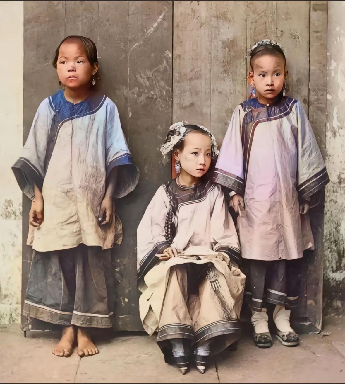 下面这张图是伯明翰大学馆藏的一张清朝女孩的同框合影,时间标注为1900年,原标题注释为“三位清朝女孩的命运和脚”。一坐一站一主一仆,起跑线不同,从她们脸上看不到孩童该有的纯真笑容!原注释中说左手边光脚的女孩是丫鬟,面容黝黑,穿着朴素;身上唯一的首饰就是那对耳环,她知道自己的身份,站在小姐稍远的地方。她不敢面对摄影师的镜头,目光看向一边,垂下双手不自然的扣着手指。 中间裹脚的女孩是大户人家的小姐,身上穿着华丽斜金宽袖镶边卦,胸前带着一串红玛瑙压襟,她面容精致带着漂亮的头花,精美的耳坠,头发梳着油亮,手中拿一把折扇,最引人注目的是她穿着一双三寸金莲。小小年纪就已经承受着裹脚的痛苦;她注视着摄影师的镜头,脸上没有一丝表情。大小姐挺美挺水灵的,被拘束真是太可怜了! 右手边那个不缠足的女孩是一个基督徒穿着较好。质量虽然没有小姐的高级,但也比仆人穿得好,双脚穿着鞋袜但没裹脚,在她手中也拿着一把折扇,她有点紧张的看着摄影师的镜头。 显然,照片中三个年龄相仿的女孩从衣着、发饰、鞋子、站位不同,就能看出三人的身份,地位的不同。