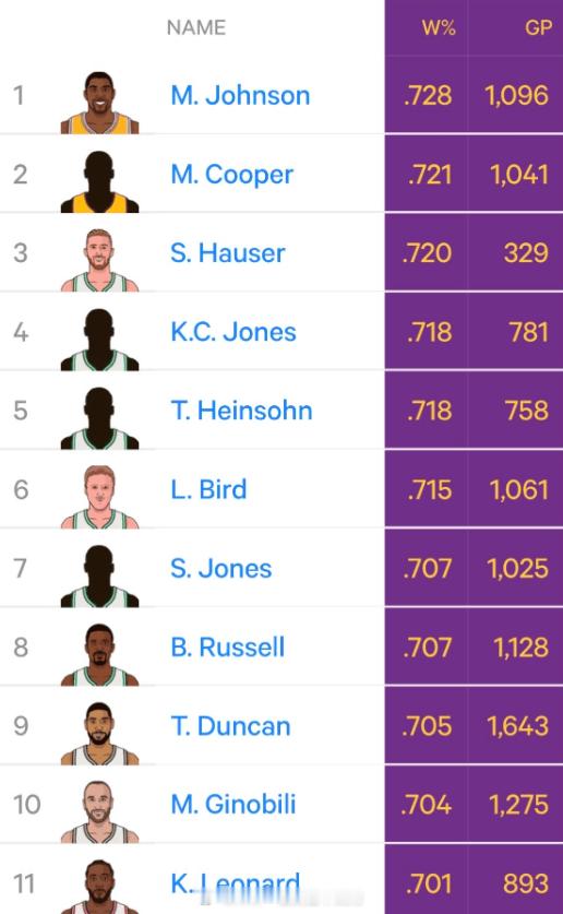 伦纳德在加盟快船之前胜率425胜153负(含季后赛),胜率73.5%历史第一,如今生涯战绩626胜268负,胜率70%,如今他已跌出历史前十。真没想到这赛季能输这么惨…