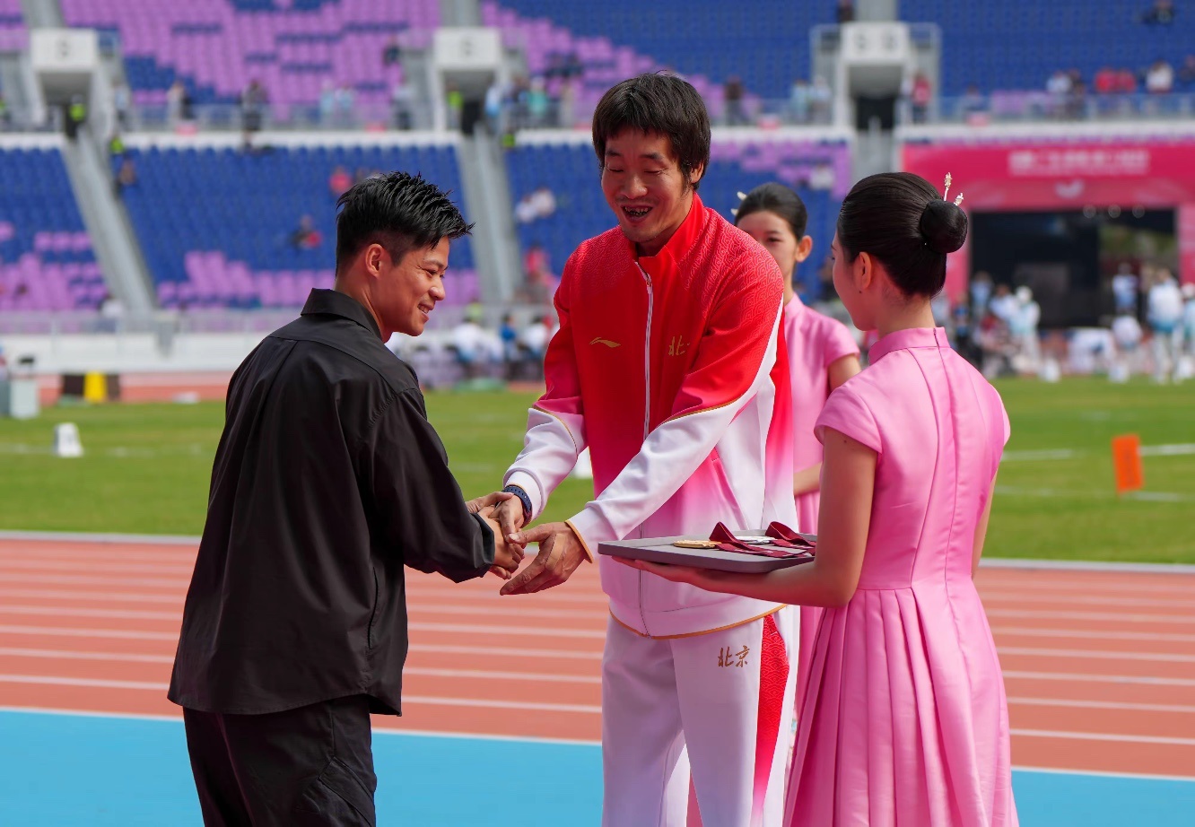 苏炳添现身残特奥会现场,为获奖运动员颁奖。