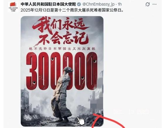 这次我们一个日本字都没写!中国驻日大使馆今天(12月13日)发文写道:2025年12月13日是第十二个南京大屠杀死难者国家公祭日,并附图,图中,巨大的红色 “300000” 字样让人醒目,一位衣衫褴褛、身形佝偻的受难者形象立在下面,当时的绝望和苦难是我们现代人无法想象的。 这红色的“300000”从不是刻意煽动仇恨,而是刻在民族骨血里的警示。不用日文赘述,因为真相本就无需翻译,右翼分子的否认与挑衅,不过是自欺欺人的徒劳。 从白江口之战到九一八事变,日本对华夏的觊觎从未真正停歇,岛国的危机感终究成了侵略的借口。但今时不同往日,我们铭记历史从不是为了报复,而是为了筑牢底线——谁敢阻挠统一大业、触碰民族红线,必遭雷霆反击。 公祭日的钟声是警钟也是誓言,山河无恙的今天更要警惕军国主义阴魂。你觉得我们该如何让这段历史永远不被遗忘?