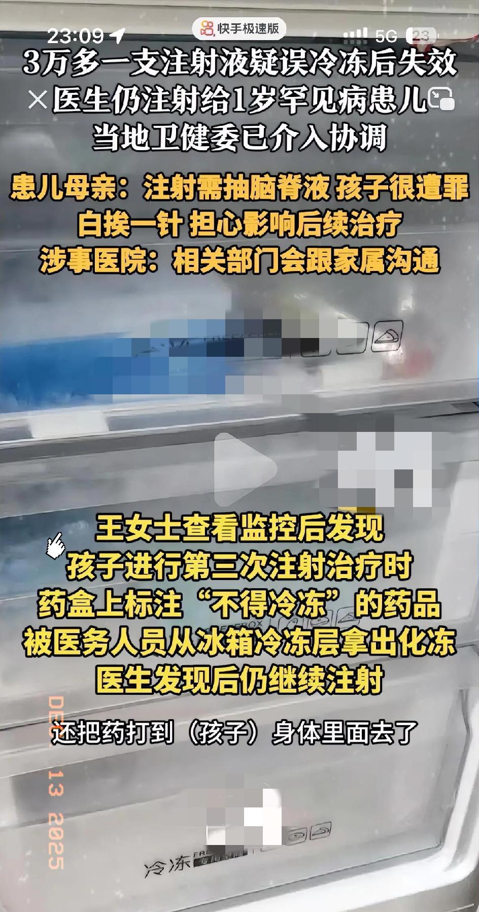 难怪这位妈妈不依不饶!3万多一支的注射液被误入冷冻后失效,医生在明知道失效后还给自己的孩子用 关键孩子还是罕见病,医生在注射时药盒上写着不得冷冻的药品,却还是直接从冷冻层拿出来化冻后继续给自己儿子用 这哪里是疏忽,分明是拿患儿的生命当儿戏!蛋白质类生物制剂冷冻后会变性失效,药盒上的警示不是摆设,而是无数实验验证的安全红线。 1岁宝宝抽脑脊液注射本就遭罪,这3万多一针的药是救命的希望,前几针更是决定能否直立行走的关键窗口期。医生明知故犯的操作,毁掉的不只是一支药,更是一个家庭的全部期盼。 医疗的底线是敬畏生命,而非敷衍了事。这种违规操作绝非个例,若不严惩,谁还敢放心把家人交给医院?你觉得该如何杜绝医疗中的这种“致命疏忽”?