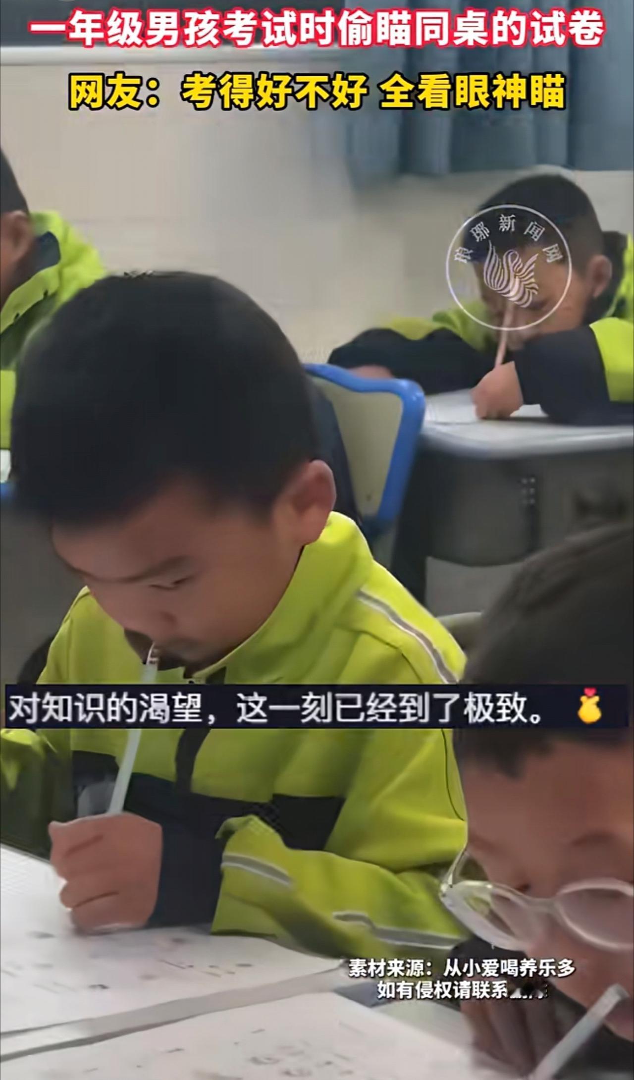 一年级男孩考试时偷瞄同桌的试卷,网友:考得好不好 全看眼神瞄。小W