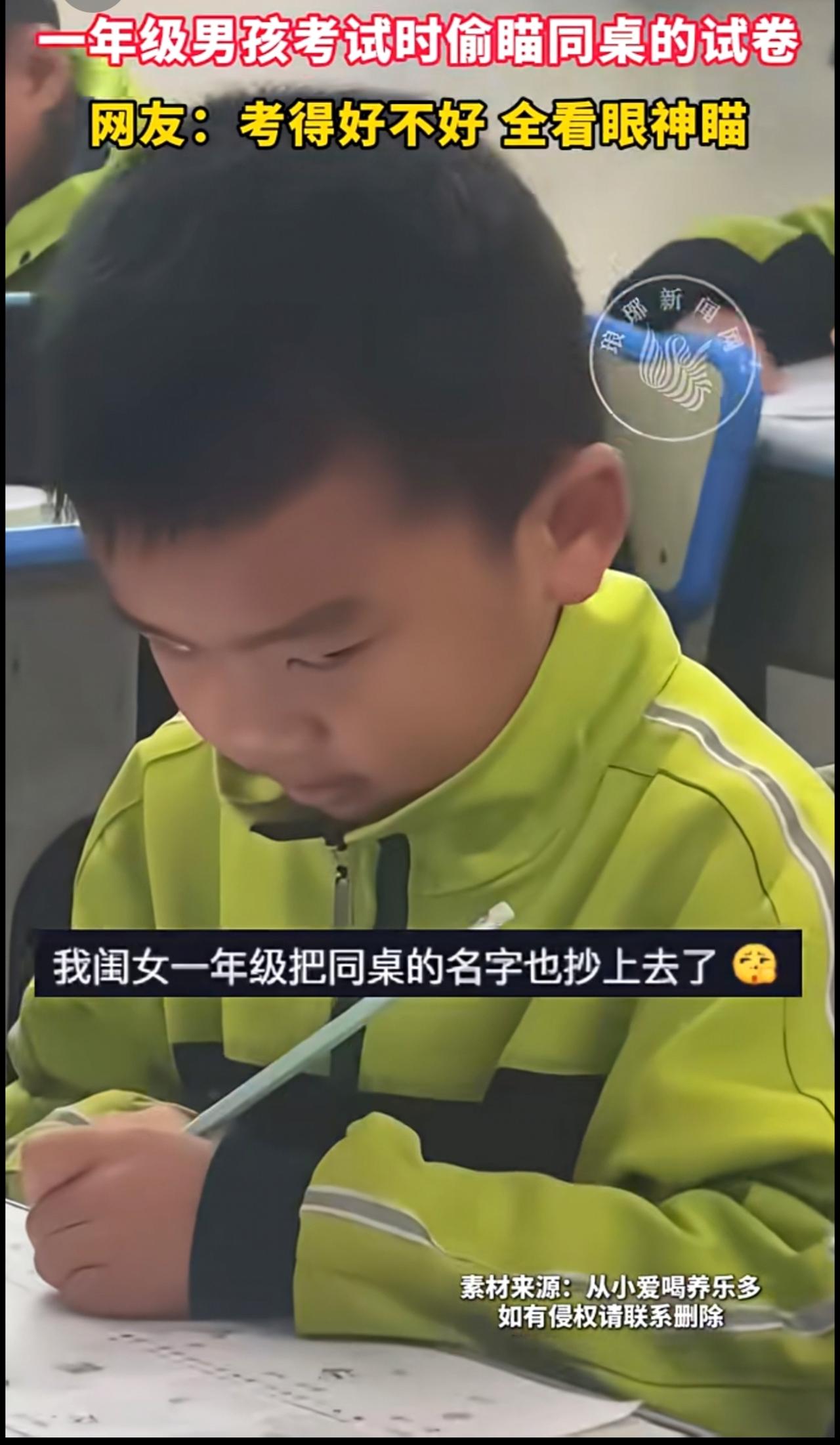 一年级男孩考试时偷瞄同桌的试卷,网友:考得好不好全看眼神瞄。小W