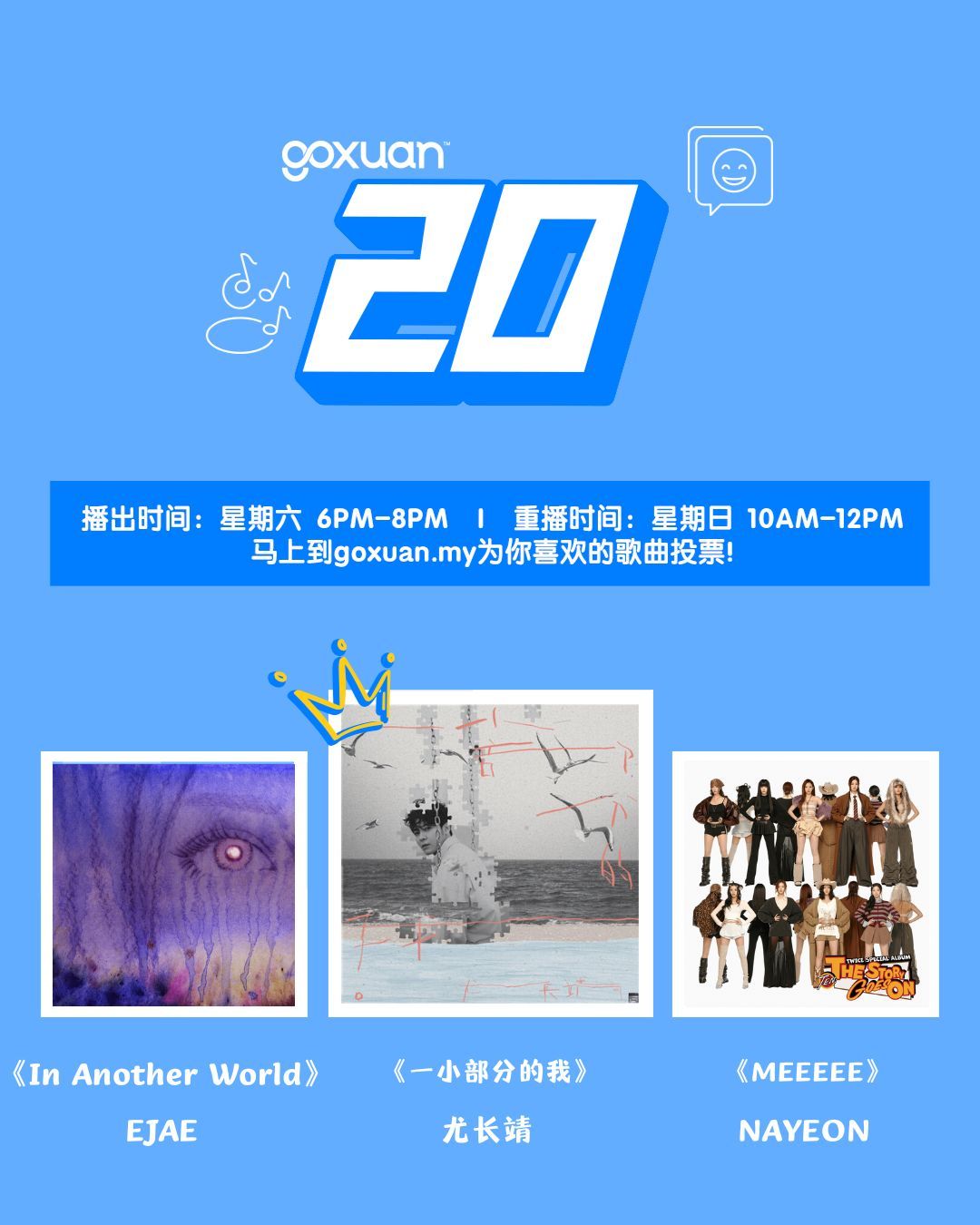 马来西亚电台GOXUAN 20 (2025年12月13日)榜单前三强冠军🏆 尤长靖 《一下部分的我》亚军🥈 EJAE 《In Another World》季军🥉 NAYEON 《MEEEE》