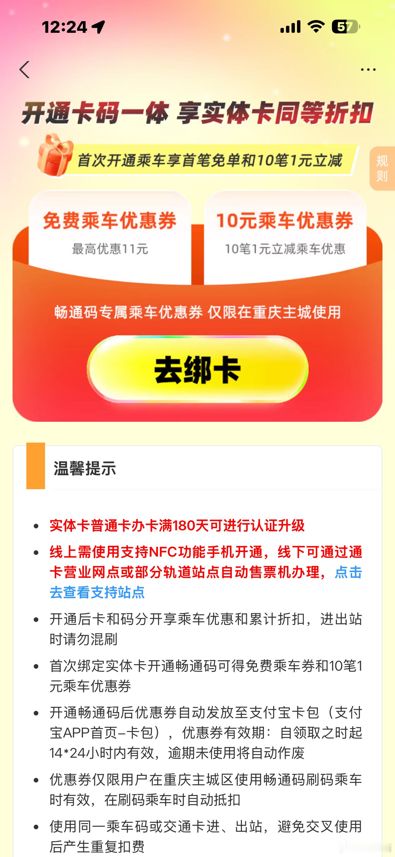 支付宝的乘车码支持绑定实体卡了,这样刷码乘坐公共交通也能享受换乘优惠。线上绑定需要一台支持 NFC功能的手机。