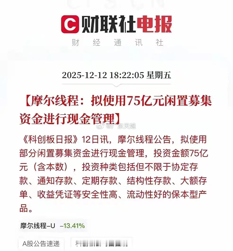 摩尔线程募集的资金拿来做投资理财去了,摩尔线程上市募集80个亿,交完税过后75个亿,根据摩尔线程的公告,投资金额75亿元,投资银行理财期存款,定期大额存单,这募集资金不是用来让你去搞开发,搞研究,搞科技技术突破,结果变成了募集资金去用来理财,这是怎么回事?这个公告一出来,昨天股价大跌18%。搞不好下周应该还有机构资金会卖出,这短期募集那么多资金,这一时半会也用不完,搞科研还需要时间,大概率是想把这些钱拿去投资赚利润,对于投资者来说,不知道是什么想法!