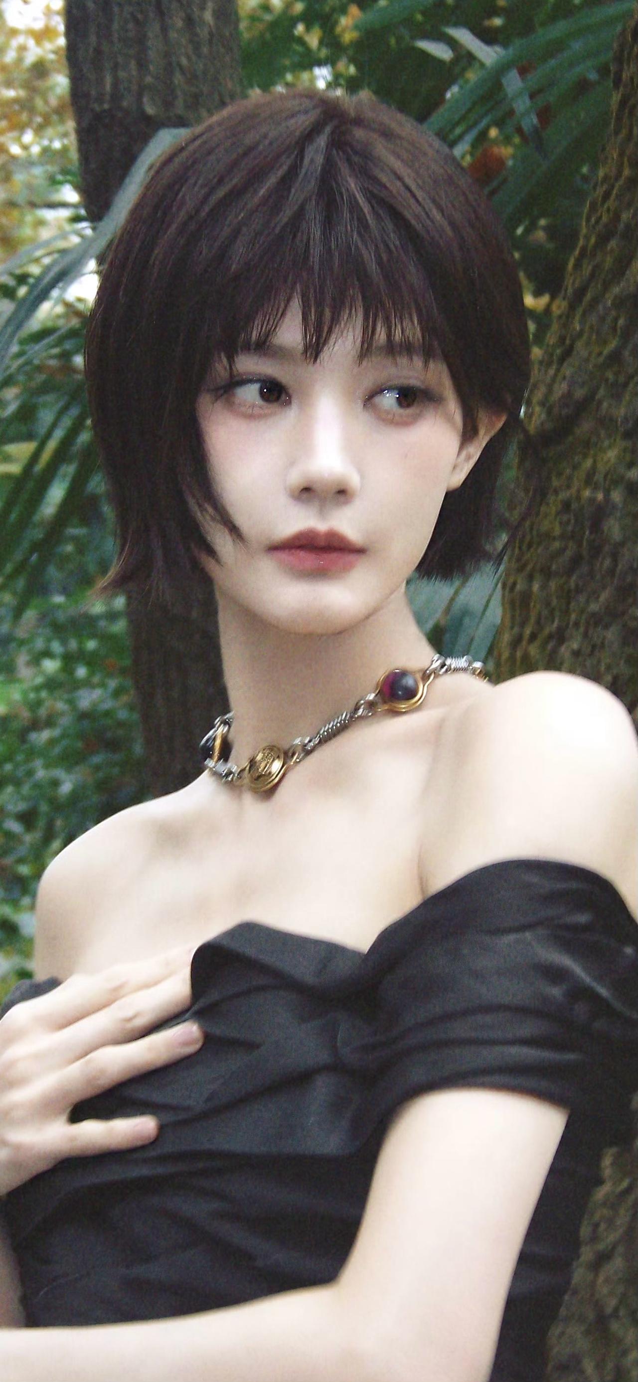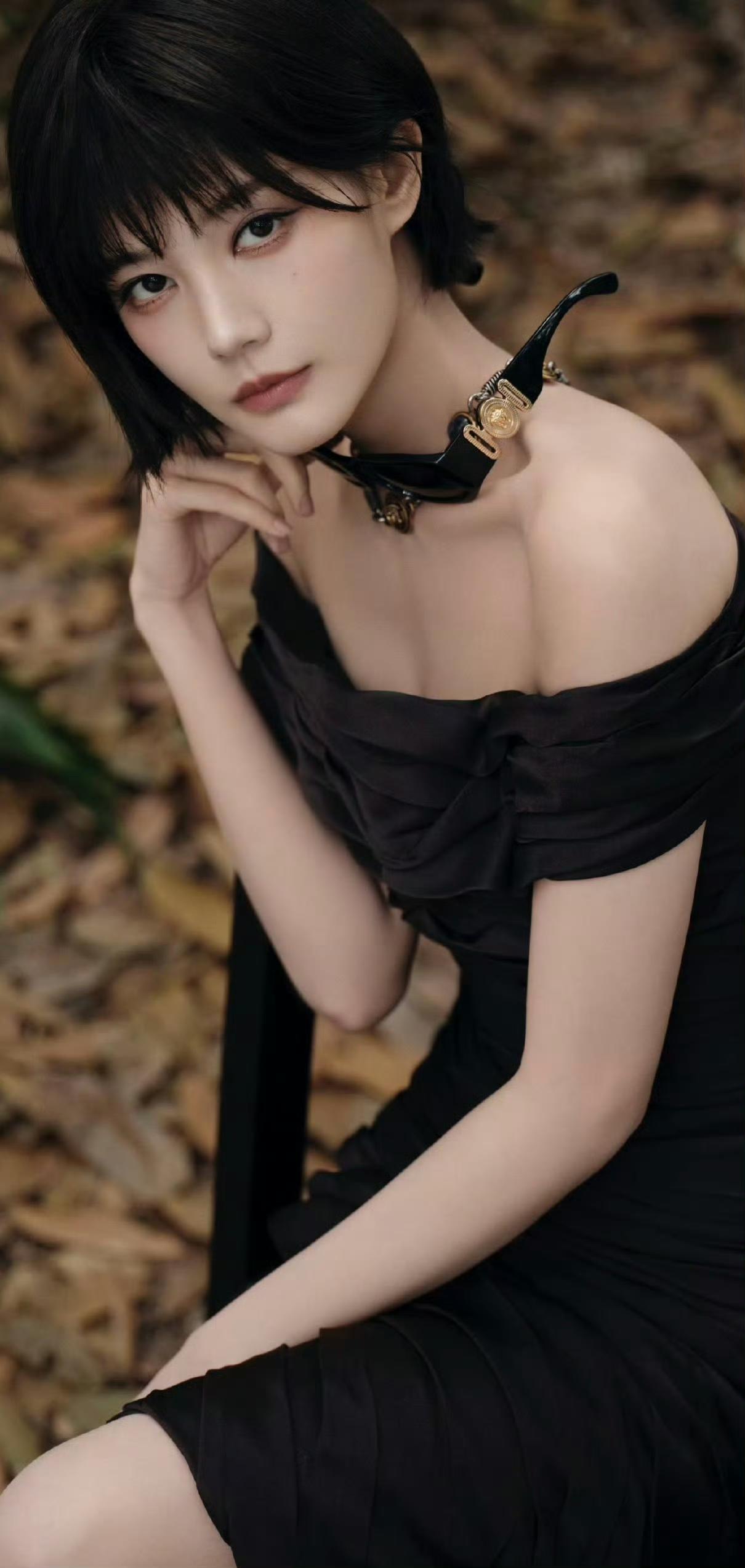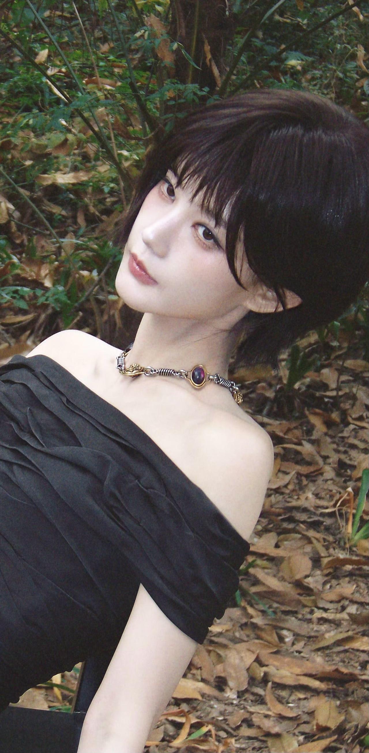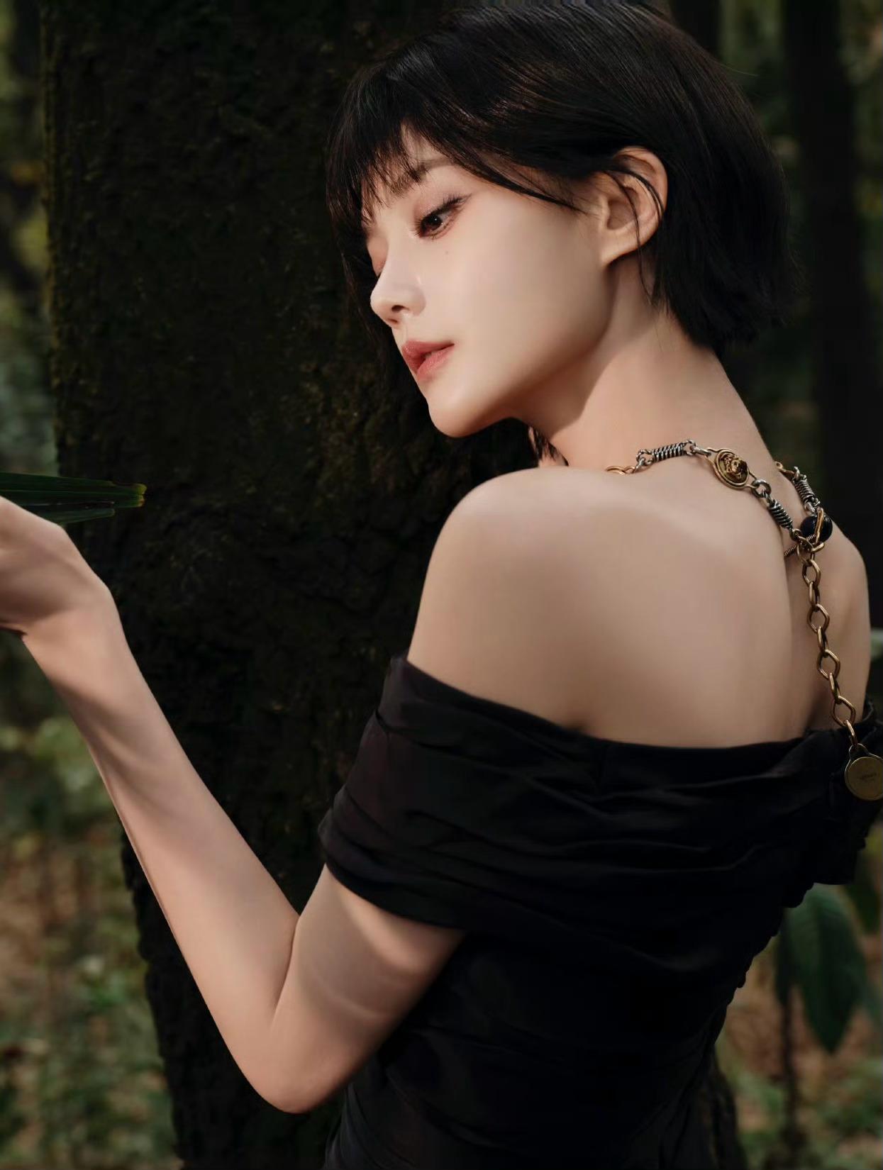 黑裙黑发,优雅坐于林间,静谧如画。李一桐!!!