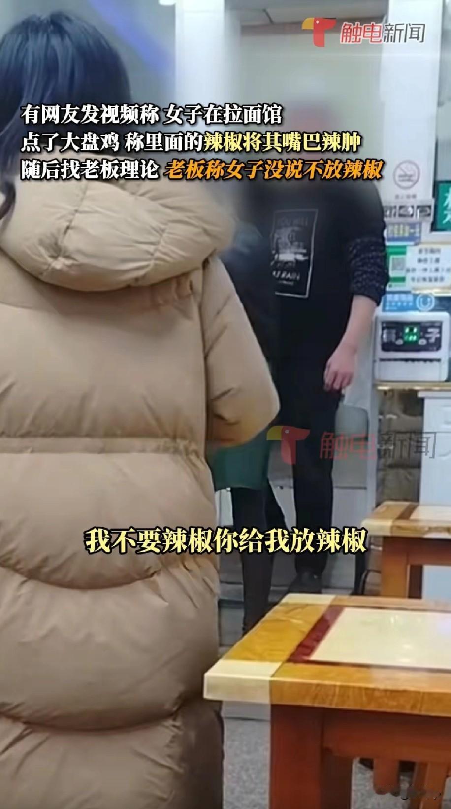 女子在面馆点了一份大盘鸡 吃饱后打包带走,一个小时后又回来了 找到老板说嘴被辣肿了 老板说你不吃辣椒当时为什么不说 女子则是自顾自的说自己还在哺乳期 干嘛放这么多辣椒,必须赔偿 双方开始争吵不休,老板急了,顺手拿个凳子要扔过去,老板娘赶紧阻止 女子被吓的退到了门口,还喋喋不休的说,要赔偿,不赔让你的生意做不成 老板强压怒火说要调监控报警,女子又说了,作为服务人员你的态度不好, 必须赔钱,不赔钱把你的店给拆了,看谁杠的过谁,女子越说越难听 面馆老板彻底怒了,从厨房冲了出来 女子吓的赶紧跑了,老板硬是没追上,周围也有不少吃瓜群众,老板又耐心把事情原由给他们说了一遍 女子敢惹西北面馆的也是个狠人,她压根可能不知道他们的厉害,再说这个无理由赔偿根本不成立,幸亏是跑的快,不然真得挨两下,下次可别去了
