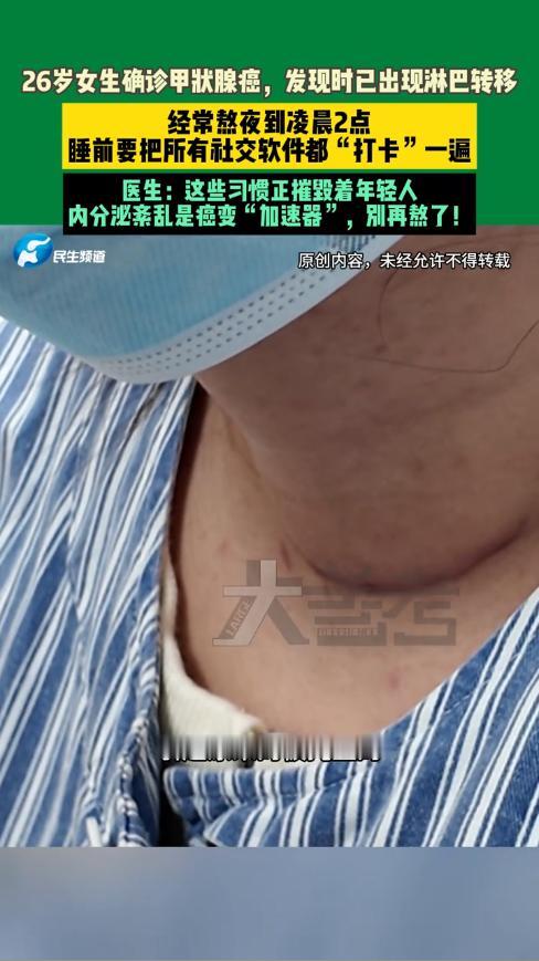 “悲剧还是发生了!”近日,河南郑州,一女子因严重拖延症,每晚都要熬到一两点才睡觉,结果脖子突然肿了起来,一碰就疼!女子非常害怕,就去医院检查,结果被诊断为甲状腺癌,而且已经淋巴转移。网友:还敢熬夜吗? 现在很多年轻人因为工作压力大,所以下班很晚,有时还要熬夜加班,再加上对手机的依赖较大,久而久之,作息就变得异常紊乱,身体出问题那是迟早的事。 据媒体12月12日的报道,女子今年才26岁,每天虽然6点就下班了,但是回家后她却什么活都不想干,一直拖到12点才去洗漱。 可是躺到床上后,女子依然不休息,还要再玩一会手机才行,每天都要一两点再休息。 这样的日子女子不知道重复了多少天,结果一天醒来后,她照镜子时感觉脖子变粗了不少,用手轻轻戳了一下,还隐隐有些痛。 之后的日子里,女子的脖子似乎变得越来越粗,她逐渐有些担心,就去医院做了检查,没想到竟然是甲状腺癌!而且已经转移。 医生在听了她的讲述后,很快就找到了病因,女子每天熬夜导致内分泌紊乱,而甲状腺则是一个很重要的内分泌器官,由于一直得不到休息,所以发生了病变。 由此可见,真正摧毁人身体的,都是些不良习惯,如果放任不管,身体早晚会吃不消,所以为了一个健康的未来,大家一定要养成合理的作息习惯。 信息来源:《26岁女生确诊甲状腺癌,发现时已出现淋巴转移》大象新闻