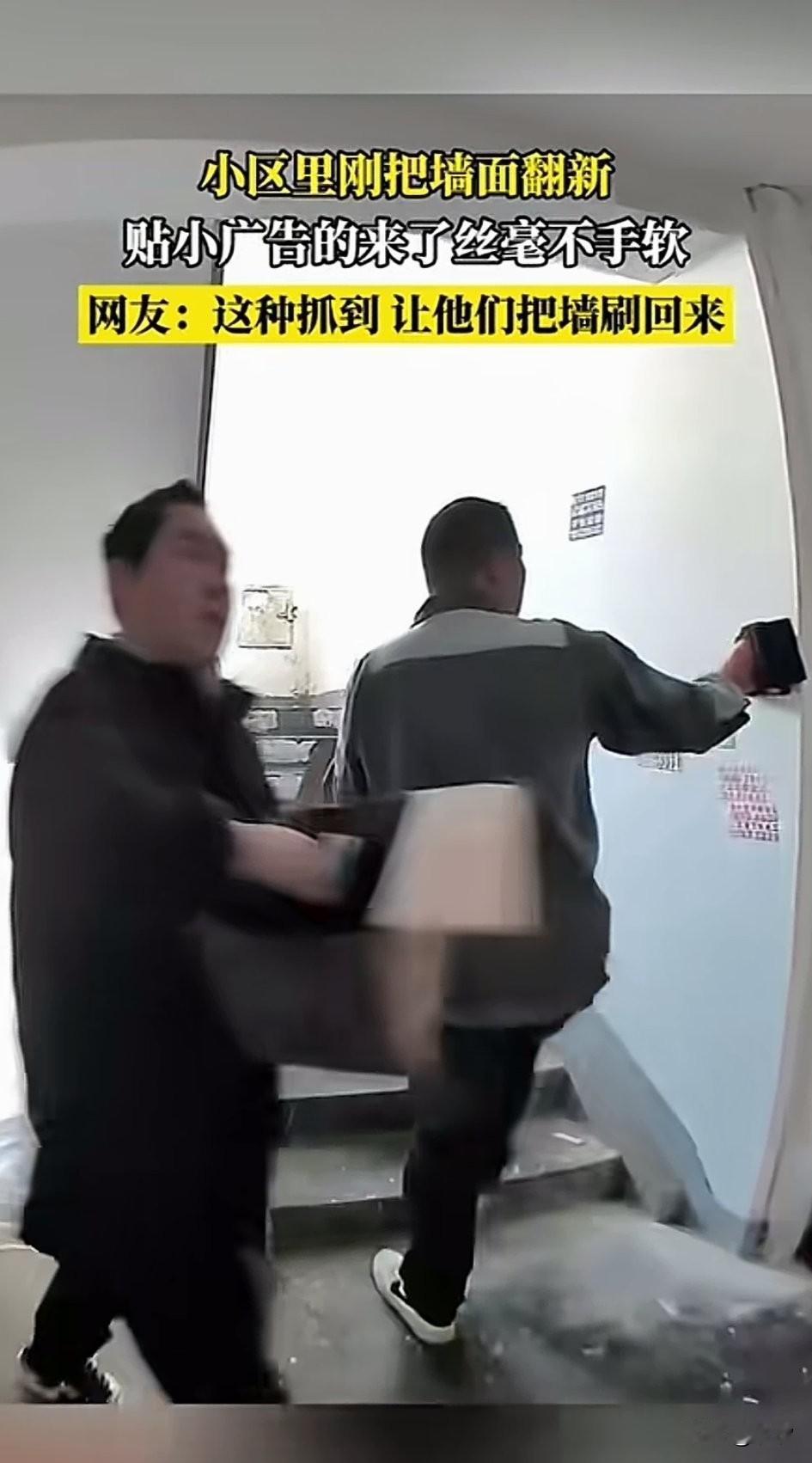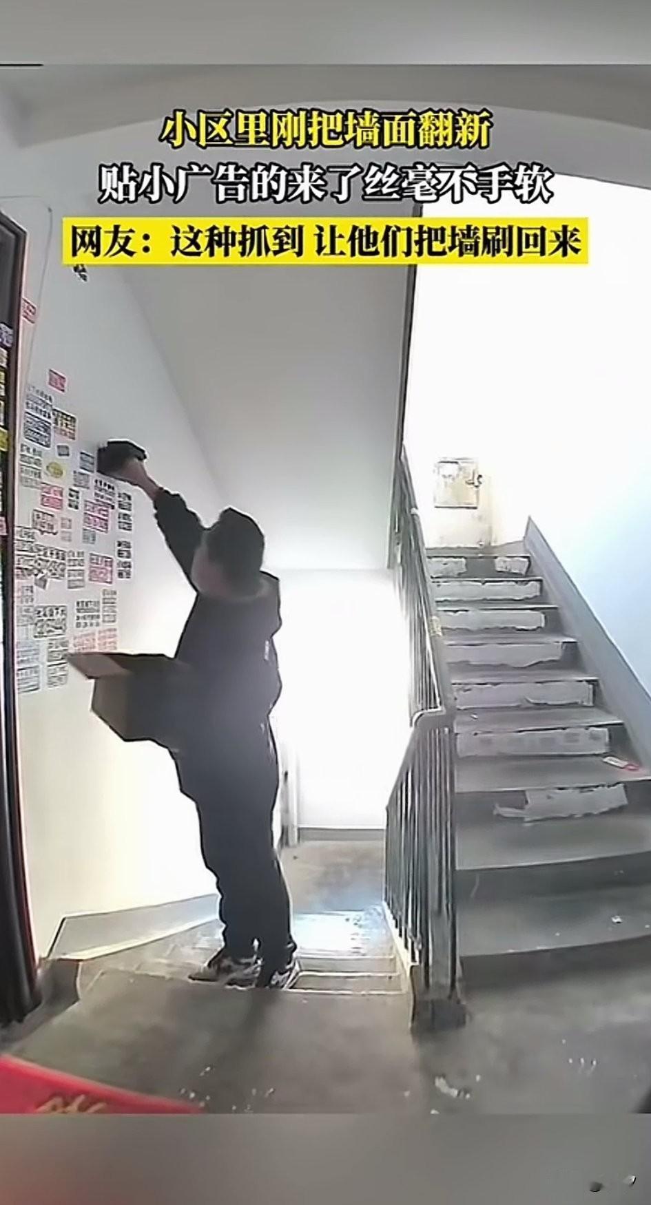 山东的某处老小区, 物业刚把公共区域的楼道刷干净, 就有几名贴小广告的人员来了, 他们拿着印章, 在白色的墙上到处盖章, 本来刚刷好的墙面, 这回又不干净了, 不能说物业没有刷墙, 只是到处都是小广告, 这还真让人反感, 这一幕刚好被一户家人的监控拍到, 这就是老破小小区的管理, 大门口门卫大爷不管事, 小区连个像样的监控都没有, 也没有多余的保安去巡逻, 物业费低的喜人, 物业工作人员工资待遇差, 工作起来自然非常懈怠, 可以说就是养老岗, 这就给那些贴小广告的人机会, 于是他们组团就去老小区贴广告, 广告效果不知道, 小区环境被他们搞得一团糟, 大家对于山东某小区被乱贴小广告怎么看? 乱贴的小广告 小区靓丽 对门的小广告 小区门头广告 老小区新貌 物业广告牌