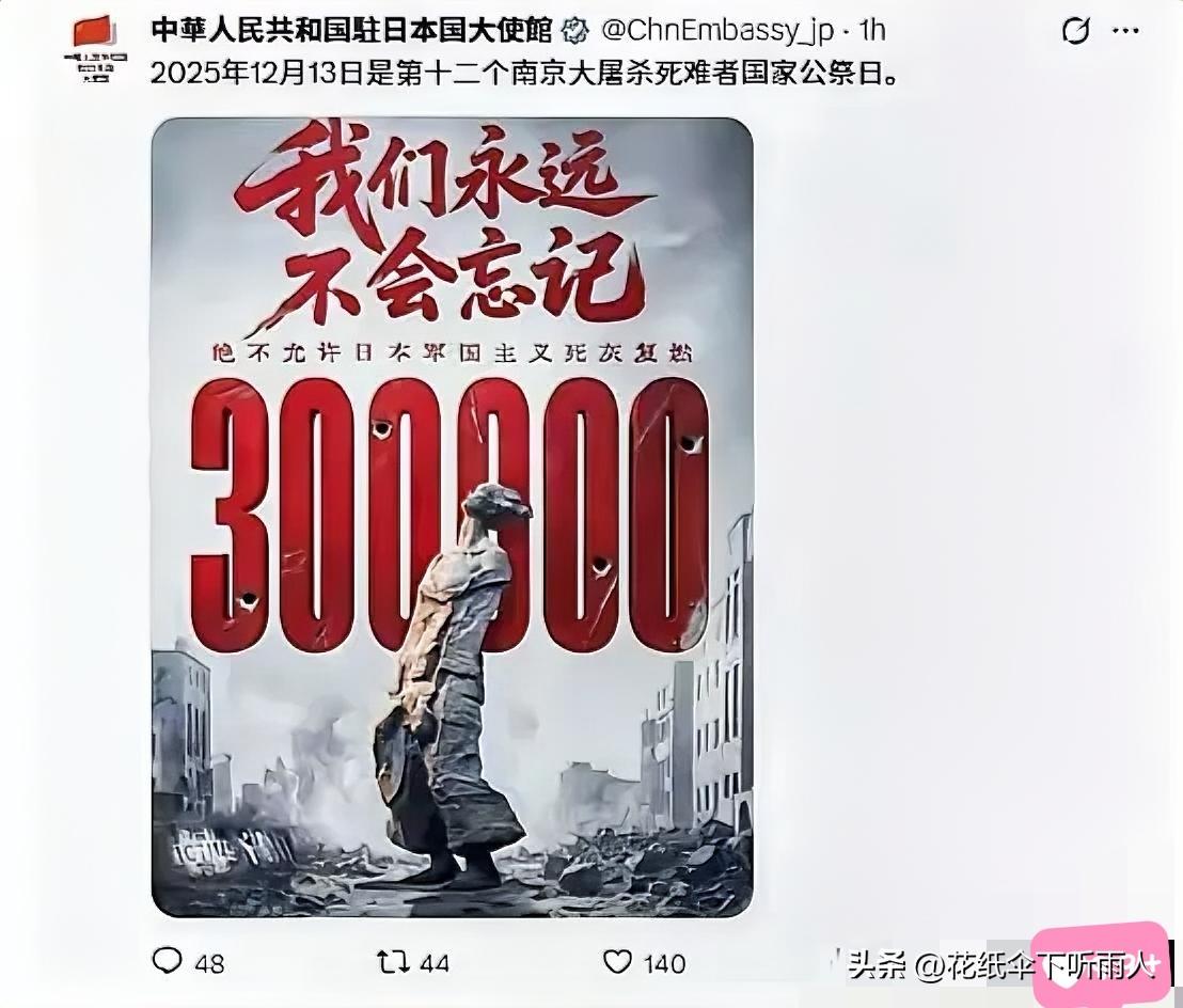 这次我们一个日本字都没写!中国驻日大使馆今天(12月13日)发文写道:2025年12月13日是第十二个南京大屠杀死难者国家公祭日,并附图,图中,巨大的红色 “300000” 字样让人醒目,一位衣衫褴褛、身形佝偻的受难者形象立在下面,当时的绝望和苦难是我们现代人无法想象的。 配图里的画面直击灵魂:巨大的红色“300000”字样醒目刺眼,下面立着衣衫褴褛、身形佝偻的受难者,那份绝望和苦难,隔着屏幕都让人窒息。 88年前的今天,南京沦陷,40多天的血腥屠杀里,30多万无辜生命惨遭戕害。这不是冰冷的数字,是一个个家庭的破碎,是民族永远的伤痛。 不写一字谴责,却用铁证诉说真相。铭记不是为了延续仇恨,而是为了守护和平。吾辈当自强,才对得起逝去的同胞!