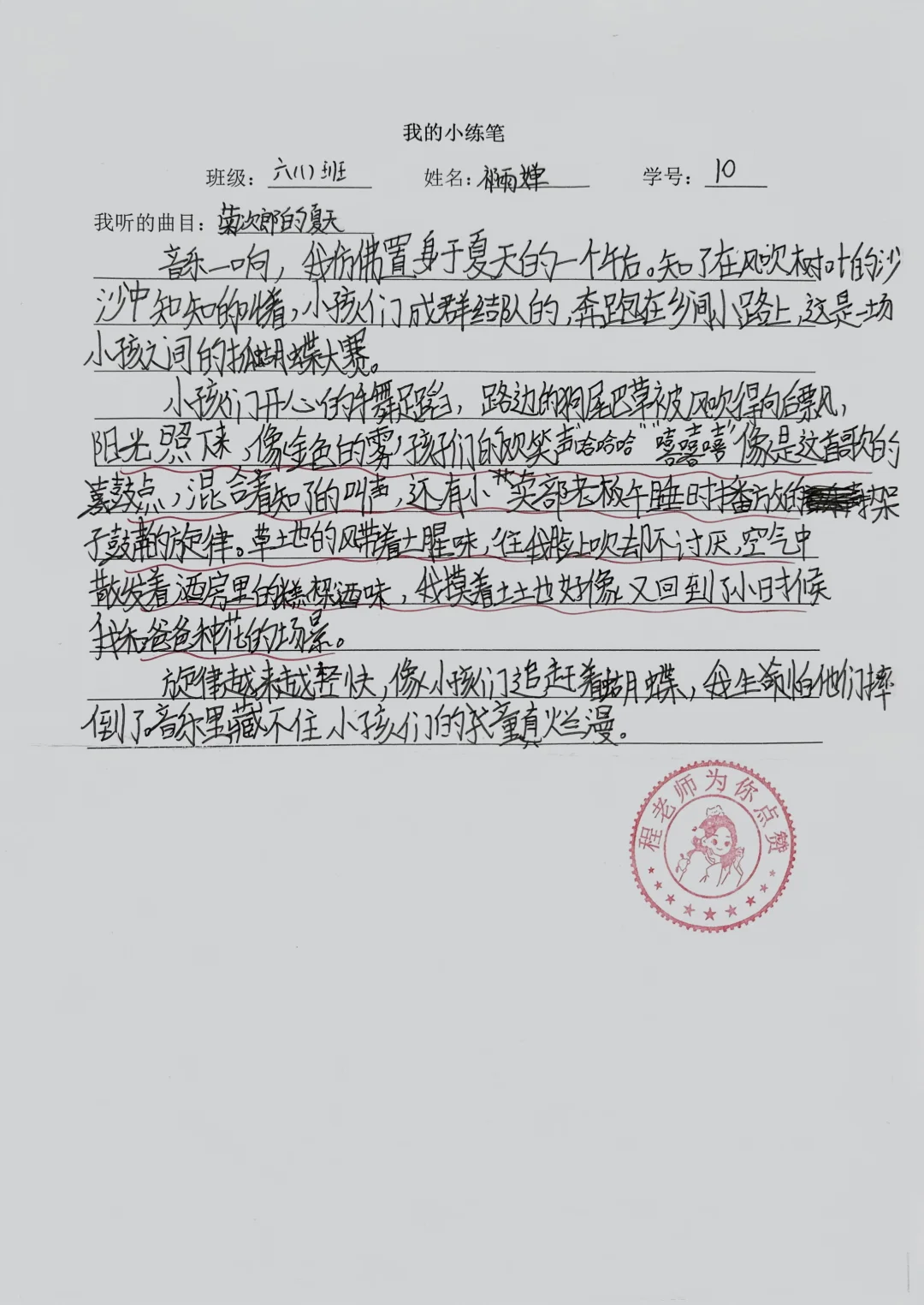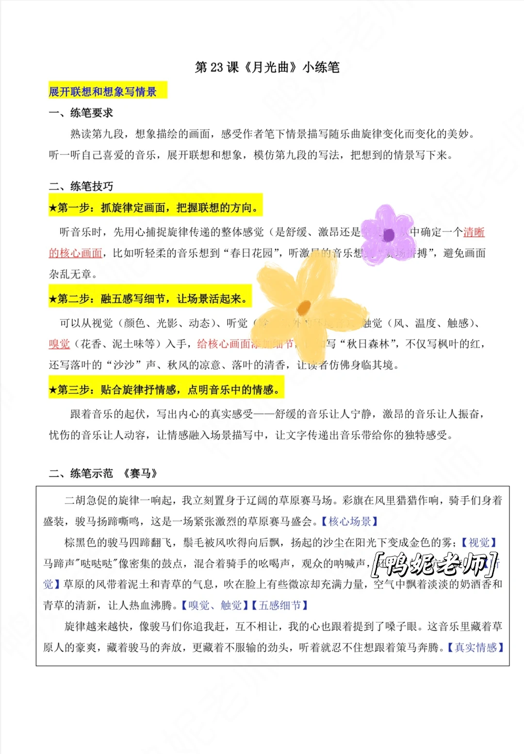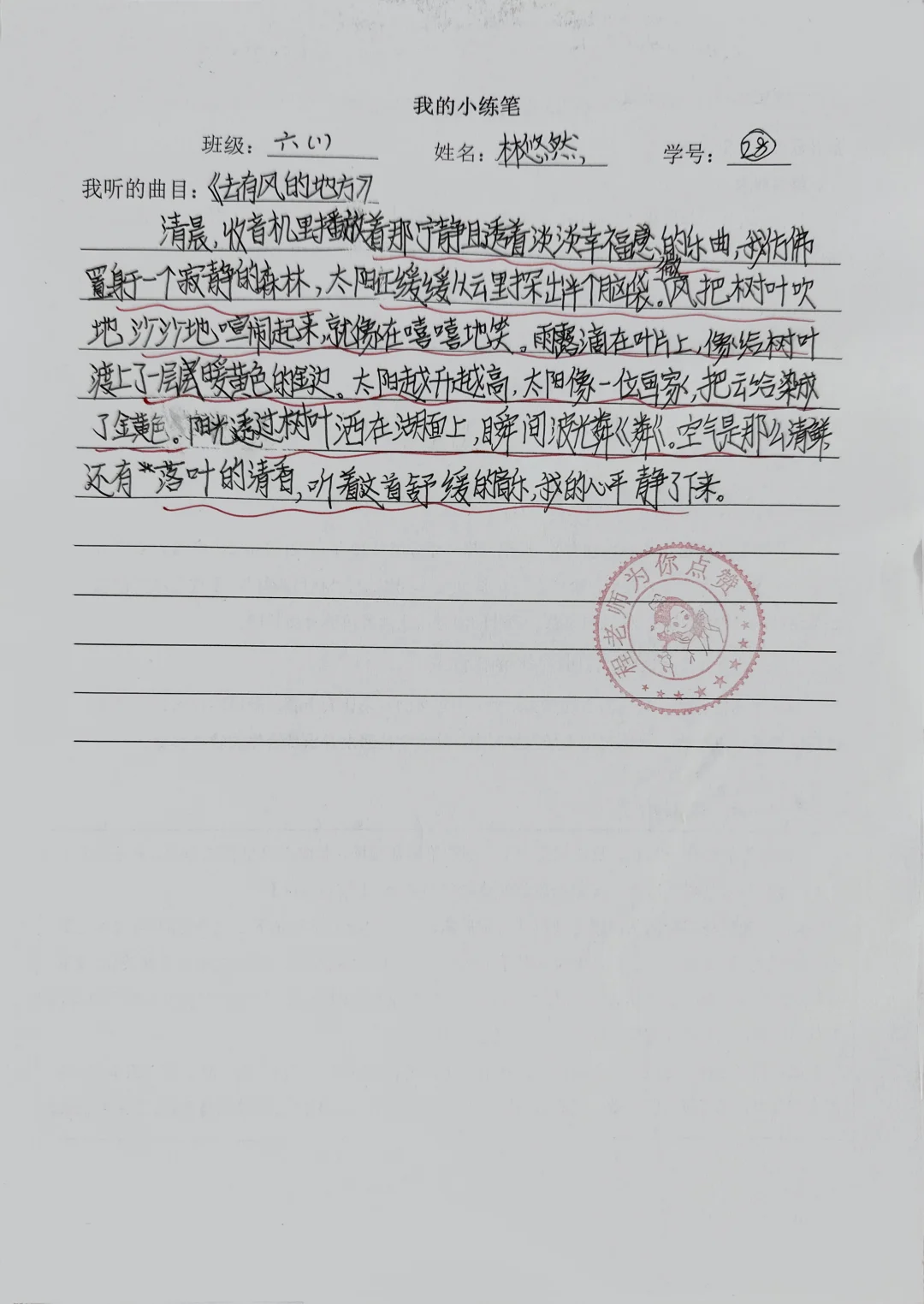 [向右R]练笔要求:听一听自己喜爱的音乐,展开联想和想象,把想到的情景写下来。 [向右R]练笔技巧: 第一步:抓旋律定画面,把握联想的方向。 第二步:融五感写细节,让场景活起来。 第三步:贴合旋律抒情感,点明音乐中的情感。 🍃跟着音乐的起伏,写出内心的真实感受,让情感融入场景描写中,让文字传递出音乐带给你的独特感受。