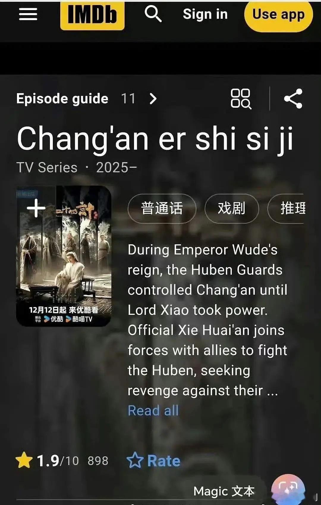 成毅新剧《长安二十四计》播出不到一天,海外平台imdb评分已经被打到1.9分了,真的被下黑水,黑粉也太努力了