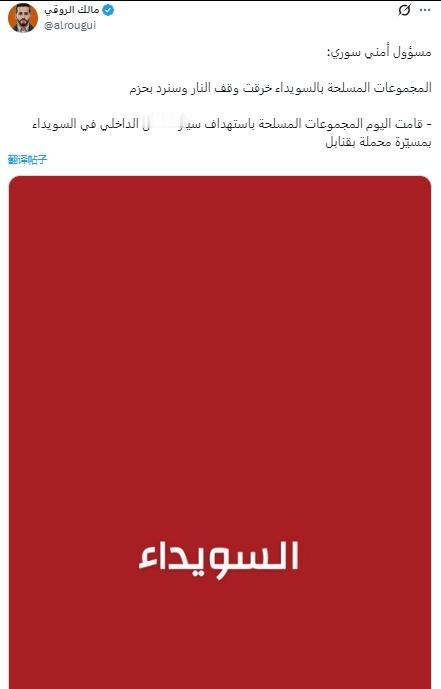 叙利亚苏韦达省局势再次趋于紧张,HTS政权指责德鲁兹民兵违反停火协议使用无人机袭击HTS的军用车辆。 ​​​