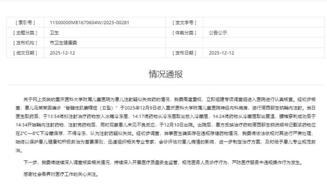 为何现在大众对医生的整体印象不如以前了?说白不就是因为有些医生没了医德吗! 据四川的王女士透露,自家一岁的孩子,患有脊髓性肌萎缩症,重庆医科大学附属儿童医院接受治疗,总共需要给孩子进行4次鞘注,而每支注射剂费用为3万3千多元,药剂贵也就算了,而且每次注射的时候,还需要抽取患儿5毫升脑脊髓液与注射剂相兑,孩子都是很遭罪的。可在第三次治疗的时候,王女士却发现说明书上标注了,需要2~8度冷藏不得冷冻的注射液,却是在被冷冻后拿出,而且医生是不管不顾继续进行注射。 王女士担心被冷冻的药失效,会影响到孩子后续的治疗,所以就向医院进行了反馈,同时也已经封存了孩子的病历。随后重庆卫健委介入,确定涉事医生,存在违规储存药物的行为,已经对其进行了严肃处理,并且组织了专家对孩子情况进行评估,进一步确定治疗方案。如果是其他行业,你失误后大不了重新再来,可在医院可不敢失误,一旦失误了,就有可能会是血的代价。 而且据王女士透露,如果按照正常疗程治疗,孩子有机会独立行走的。也许正是这一剂疑似失效的药剂,就有可能耽误孩子的治疗,导致孩子以后再也站不起来。如果是其他难以避免的错误也就算了,这很明显是基础性的错误,是完全可以避免的,并且还不是第一次操作,可为何却没有避免?而且我相信这位医生不是不知道,自己已经犯了一个错误了,可他为何还要错上加错? 难道不是自己的孩子,自己不知道心疼?还是说别人家孩子的命,就不是命?大众从来没有要求过,医生能够像是个神,因为这本身就不现实,但是最起码当医生的,要先当个人吧!