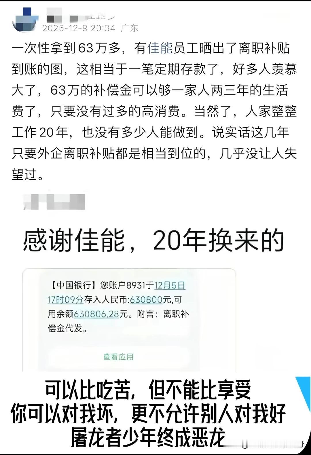 别被“恶意补偿”带偏!打工人拿63万补偿晒图,咋就成了炫富? “恶意补偿”这四个字,最近真是越听越荒谬。 佳能中山一位20年工龄的女工,拿到63万离职补偿晒了张到账截图,结果被平台按“炫富”下架。更离谱的是,还有人跳出来说,外企给高赔偿是在“恶意拉高成本,制造对立”。 合着企业在N+1法定标准外,多给员工一点体面,反倒成了罪过? 要知道,佳能给的是2.3N+就业支援金,2022年珠海工厂关停,30年工龄员工拿了150万;微软中国裁员也给过N+6。这不是阴谋,是对员工十几年、几十年劳动价值的尊重。 那位女工的63万,是流水线20年的汗水换来的,不是天上掉的馅饼。可偏偏有人信奉“能吃苦不能享受”,觉得打工人拿补偿就是“不配”。 我们真正该警惕的,从来不是外企的高赔偿,而是三件事: 1. 把N+1当成上限、甚至逼员工主动离职的黑心企业; 2. 把合规补偿说成外资阴谋的歪风舆论; 3. 逼着打工人比谁更能忍的畸形价值观。 好聚好散本该是职场常态,别让“恶意补偿”的帽子,盖住了打工人本该有的尊严!