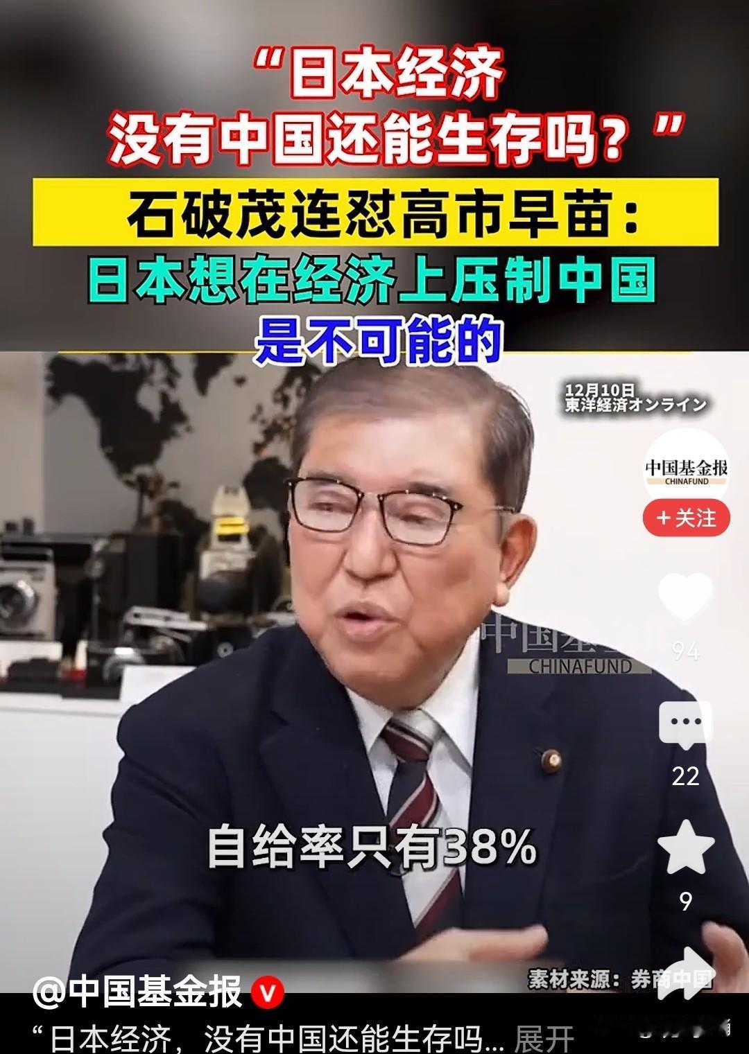 没有中国日本能存在吗?这是日本前首相石破茂怼高市早苗的。 石破茂看到了问题的本质,日本要发展就得和中国搞好关系。高市早苗破坏中日关系就是搞死日本。 看来,高市早苗搞不了多久了,石破茂还将重新上台。