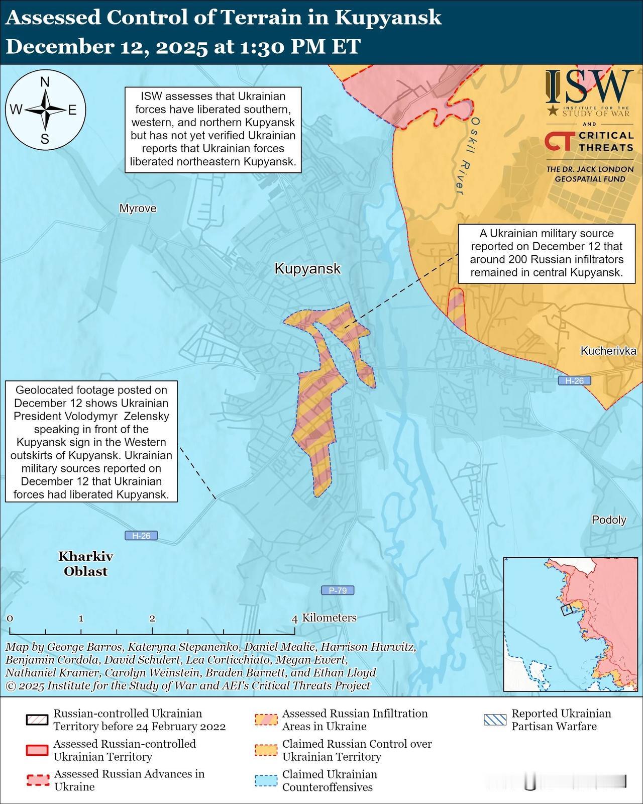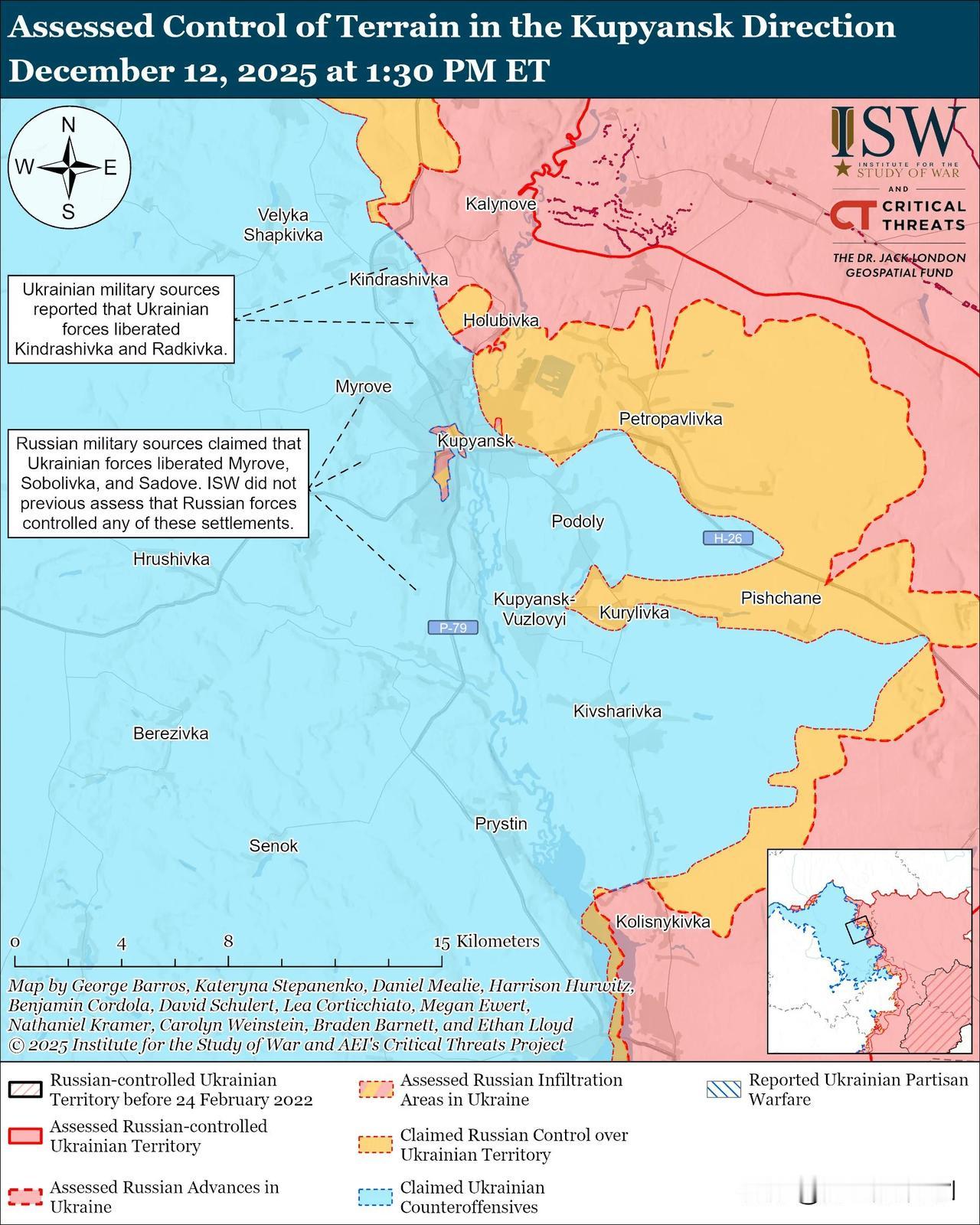 更多:乌克兰第二Khartiya军团12月12日报告说,乌克兰军队进行了一次成功的反击,以稳定库皮扬斯克方向的局势,并解放了金德拉希夫卡和拉德基夫卡(都在库皮扬斯克以北)以及周围的森林,库皮扬斯克北部的解放区,并突破到奥斯基尔河,切断了通往库皮扬斯克地区的俄罗斯地面通信线路(GLOC)。 乌克兰第2军表示,截至12月12日,乌克兰军队已在库皮扬斯克包围了大约200名俄罗斯人员。12月12日,乌克兰总统泽连斯基在库皮扬斯克西南郊区的P-07库皮扬斯克-舍甫琴科韦高速公路上发布了自己的照片,这表明乌克兰军队可能已经将俄罗斯军队推离该地区更远。 12月12日发布的地理位置录像还显示,乌克兰军队在库皮扬斯克各地活动。其他俄罗斯和乌克兰消息来源证实了乌克兰的反击。 据报道,一名隶属于乌克兰军事情报机构的消息人士报告说,乌克兰军队在库皮扬斯克包围了俄罗斯军队,清除了库皮扬斯克西北部,并解放了米罗夫、金德拉希夫卡和拉德基夫卡。消息来源指出,俄罗斯军队仍然控制着霍鲁比夫卡(Kupyansk以北)。 一位俄罗斯的米尔博主声称,乌克兰军队开始从梅罗夫(就在库普良斯克的西北部)和拉德基夫卡渗透到库普良斯克的西北郊区,这表明乌克兰军队也解放了米罗夫。米尔博主指出,俄罗斯军队并不控制库皮扬斯克东部,而流经库皮扬斯克的奥斯基尔河使俄罗斯到达库皮扬斯克中部的努力变得复杂。 其他俄罗斯军事博客声称,乌克兰军队发动了反击并取得了一些进展,但拒绝了观察到的乌克兰进展的程度。 乌克兰联合部队特遣部队11月16日报告说,它开始努力击退俄罗斯在库皮扬斯克方向的进展,而这些最近的进展可能是数周努力夺回库皮扬斯克的结果。俄乌冲突 库皮扬斯克战斗 库皮扬斯克战况