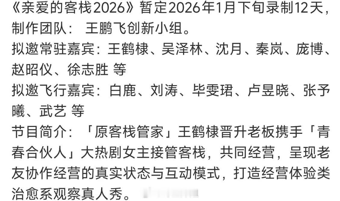 🥭综艺《亲爱的客栈2026》1月底录制常驻嘉宾:王鹤棣、吴泽林、沈月、秦岚、庞