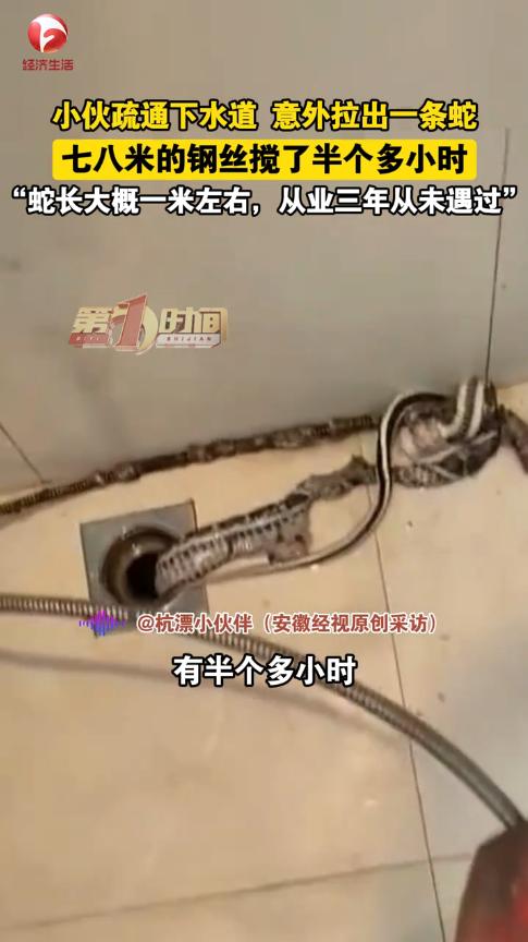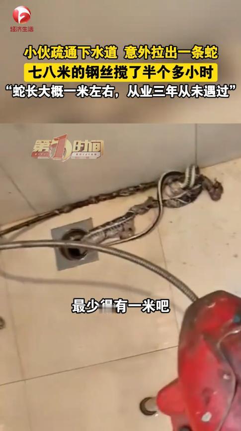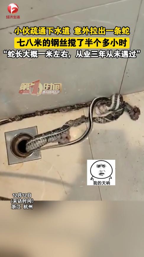 “太吓人了!”12月12日,浙江杭州,一男子上门疏通下水道,他将8米长的钢丝放下去搅拌,半个小时后又抽上来,结果竟带上来一条1米多长的蛇!虽然蛇已经死了,但还是把男子吓了一跳。网友:不敢想象下水道里都有什么! 相信很多人都遇到过下水道被堵住的窘境,虽然有的时候用热水冲一冲就能缓解,但大多数情况还是需要师傅来疏通,只是没想到,下水道里还会有蛇。 男子做家政行业已经第3个年头了,这几年,他积累了不少的经验,也收获了不少的好评。前不久,一名业主发现浴室的下水道不通畅,每次洗完澡,地上的水都要好久才能淌干,于是他就联系了男子来疏通一下。 男子收拾好工具后,立即赶往了业主的家,他将钢丝不断伸进下水道中,大约放了8米的距离,然后开始搅拌。 半个小时后,男子觉得应该通得差不多了,就开始往上收钢丝,可令所有人没想到的是,钢丝上竟然缠了一条蛇! 蛇被拉上来的一瞬间,大家都被吓得拔腿就跑,在外面看了一会儿后,发现蛇没有动静,这才意识到是条死蛇,男子这才进来给清理掉。 男子表示干了这么多年,还是头一次遇到这种事,真是太离谱了。 这么看来,有时候下水道堵塞,还真不是自己的问题,住在低楼层的人一定要小心了,下水道和马桶里都可能迎来不速之客! 信息来源:《【小伙疏通下水道拉出一条1米长蛇】》深圳新闻网