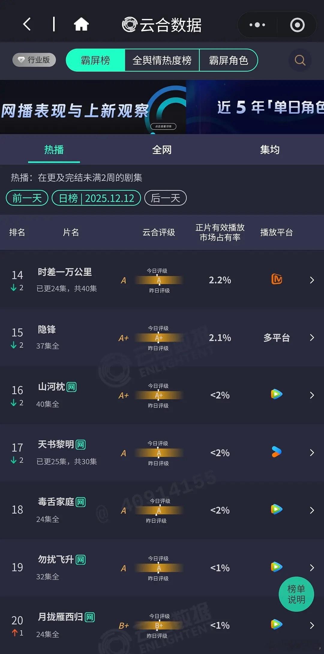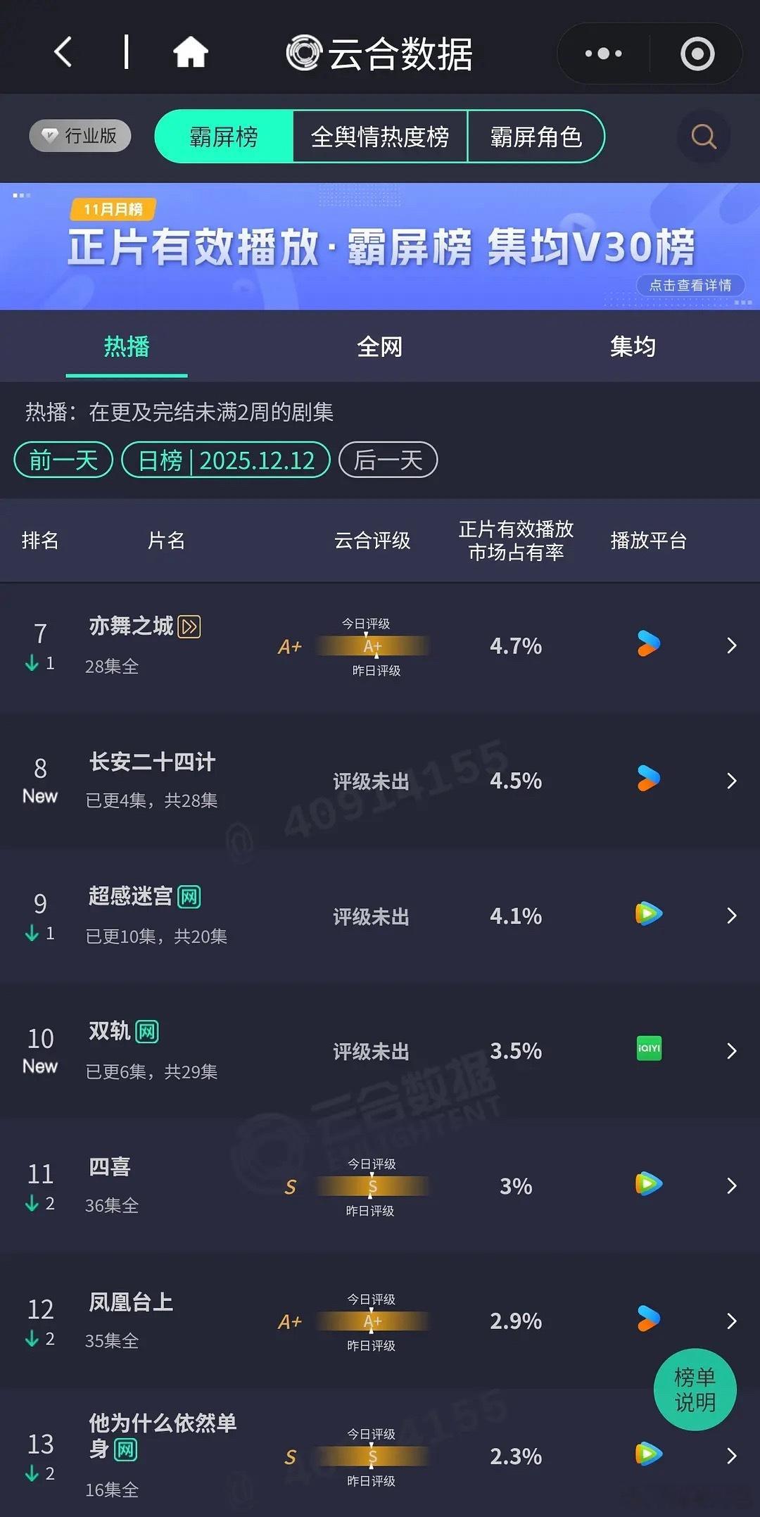 昨日云合:长安二十四计占比4.5%双轨占比3.5%