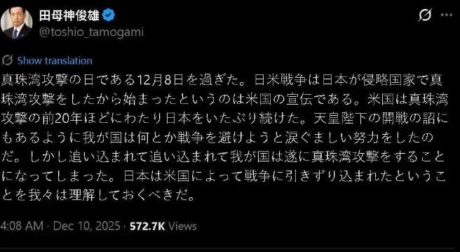 特讯!开始对美国“开火”了,日本极右翼分子通告全球,珍珠港事件,是美国对日本的栽赃抹黑,罕见措辞引爆国际舆论。他甚至颠倒黑白地声称,日本当年是在美国的“战略围堵”下“走投无路”,才“不得不”采取行动,由此可见,一旦小日本获得了核武器,能饶得了你美国吗? 美国那边刚纪念完珍珠港事件84周年,缅怀死难者,还特意强调现在和日本是盟友,没提日本的不是。 没想到这客气劲儿没换来好,日本一个叫田母神俊雄的人直接跳出来发帖,说珍珠港事件是美国编瞎话抹黑日本,气得不少人直骂荒唐。 田母神俊雄可不是普通的右翼网民,他早年当过日本航空自卫队的最高长官,也就是航空幕僚长,退役后一直活跃在右翼圈子里。 这条12月10号发的帖子,才一天多就有57万阅读、4900多个点赞,在日本右翼里号召力不小。 他在帖子里写,日本当年是被美国的战略围堵逼得走投无路,才不得不动手,把侵略者说成了受害者。 说白了这不是他第一次扯这种淡,2008年他就参加过一个美化二战的征文比赛,说中国是二战元凶,珍珠港是美国设的陷阱,还拿了一等奖和300万日元奖金。 那会儿日本政府把他解职了,却让他以退休名义走,6000万日元退休金一分没少拿,后来要他退钱也没退成,事儿就这么不了了之。 更值得琢磨的是,他和现任日本首相高市早苗走得特别近,不光多次公开支持高市竞选,还一起参加过右翼老板元谷外志雄办的活动,而元谷就是那个否认南京大屠杀的APA酒店老板。 珍珠港事件的真相摆在那儿,1941年日本海军突然袭击夏威夷基地,2400多美国人丧命,这是铁打的历史事实。 美国当年搞制裁,根本原因是日本先侵略了中国和东南亚。 现在一个退役将领公开颠倒黑白,连外国网友都看不下去,在帖子下面喊话美国:这你们能忍? 更让人警惕的是日本的核野心,有数据说日本现在存了47吨钚,够造6000枚核弹,远超民用需求,还年年从英法进口。 高市早苗上台后,右翼要“自主拥核”的声音越来越大,甚至有人提议学北约搞“核共享”,让美国把核弹部署在日本。 这么看美日同盟其实挺拧巴的,美国想靠日本牵制地区局势,刻意淡化历史问题;日本右翼却借着同盟壮胆,一边翻历史旧账,一边偷偷搞核储备。 可历史账哪能随便翻?德国要是有人敢否认纳粹罪行,早就法办了,日本却连高级将领的荒唐言论都管不住。 要是日本真有了核武器,最先头疼的可能就是美国。 毕竟田母神这种人连珍珠港的账都想赖,哪天翅膀硬了,还会把美国当盟友? 国际社会盯着的不光是这几句荒唐话,更是日本藏在背后的军事野心。 以上都是个人观点,对此您有什么不同的看法,可以在评论区留言讨论!!!