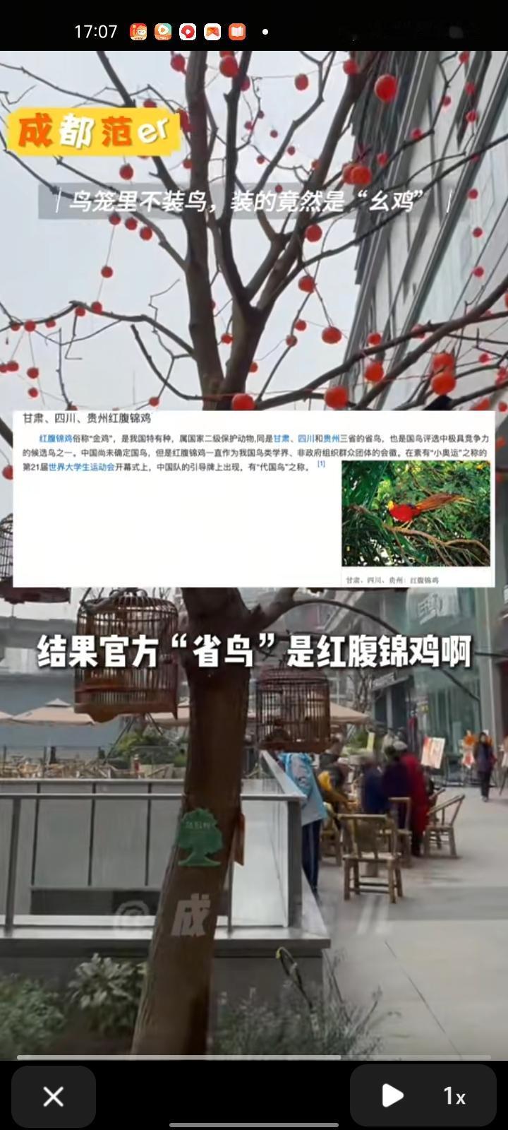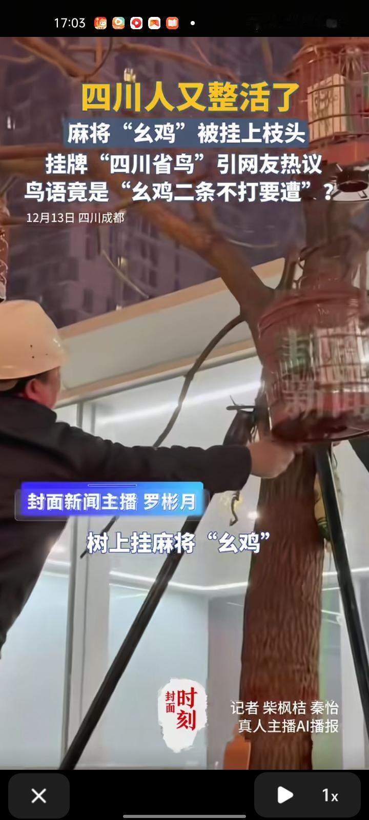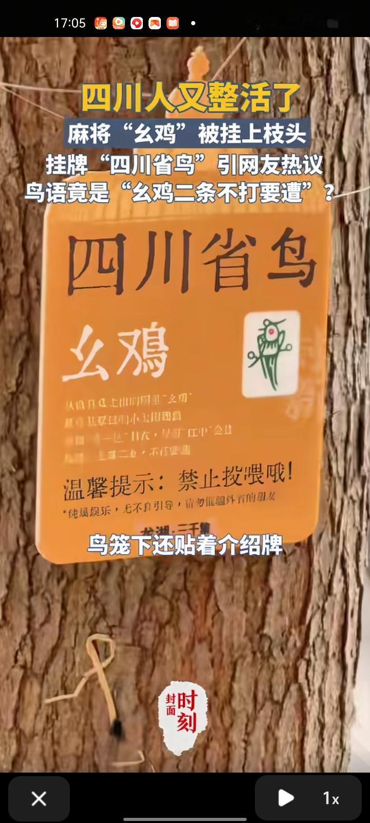 12月12日,四川成都。一商圈附近挂起几个鸟笼,结果鸟笼里不是鸟,而是“幺鸡”麻将牌,鸟笼下贴着介绍牌,说这是四川省鸟。 “四川省鸟”牌子一挂出,不少网友表示荒诞又有趣,还有网友说,四川省花应该是“杠上花”,鸟语是不是“幺鸡二条不打要遭?” 搜了四川省鸟发现,结果官方说的“省鸟”是红腹锦鸡。“幺鸡”也是鸡,你的严谨我懂的,四川人的严谨意识真是信手拈来啊。 当“四川省鸟”的牌子挂上去,大家会心一笑,是因为它既荒诞又亲切,让人在玩乐中感受到四川人乐观、松弛的生活态度。至于官方认证的红腹锦鸡,自然依旧端庄地站在生物名册里,而“幺鸡”则飞进了市井的笑声中。 毕竟,在四川,麻将是娱乐,也是哲学。上开花,是运气,也是生活的盼头。