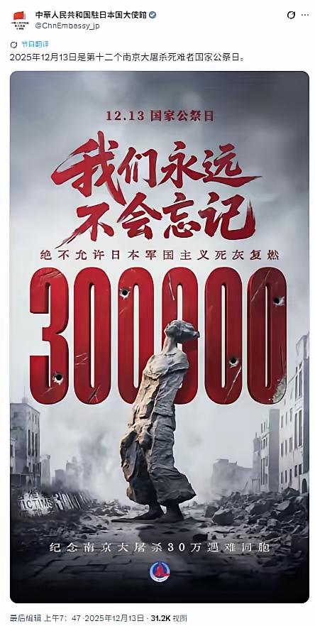 今天(12月13日)是国家公祭日,中国驻日本大使馆发布了一张海报,海报庄严肃穆,上面写着“我们永远不会忘记”,“绝不允许日本军国主义死灰复燃”,“纪念南京大屠杀30万遇难同胞”等。 麻烦各位读者点一下右上角的“关注”,留下您的精彩评论与大家一同探讨,感谢您的强烈支持! 字字千钧!句句铿锵!这张穿越海峡的海报,不是简单的文字陈列,是华夏民族对30万冤魂的庄严告慰。 是站在历史废墟上的坚定立场,是对日本军国主义残余势力的严正警示。 12月13日的南京,寒风总会带着八十多年前的悲鸣。老人蜷缩在墙角被刺刀挑开胸膛,孩童在母亲的尸体旁哭喊着被活活摔死。 妇女被强行掳走,商铺被肆意焚烧,六朝古都的石板路上,流淌的是满城同胞的鲜血。 30万,不是冰冷的数字,是30万个破碎的家庭,是30万条无辜的生命,是中华民族永远无法愈合的伤疤。 中国驻日大使馆的海报,每一个字都刻着历史的真相。“我们永远不会忘记”,是刻在民族基因里的记忆。 不是要延续仇恨,是要铭记曾经的屈辱,是要警醒后人:落后就要挨打,软弱就会被欺。 “绝不允许日本军国主义死灰复燃”,是底线,是红线,是中国人民捍卫和平的坚定决心。 这些年,日本国内的右翼势力从未消停。篡改教科书抹去侵略历史,参拜靖国神社供奉甲级战犯。 甚至有人公开否认南京大屠杀的存在,试图将侵略美化为“解放”,将暴行粉饰为“正当”。 这些拙劣的伎俩,在铁一般的历史事实面前,显得如此可笑又可憎。 远东国际军事法庭的判决书还在,幸存者的亲身讲述还在,考古发现的遇难者遗骸还在。 每一份证据,都在诉说着日军的残暴;每一个细节,都在揭露着军国主义的罪恶。 中国驻日大使馆在国家公祭日发布这张海报,意义深远。是在告诉日本政府和人民,历史不容篡改,罪责不容推卸。 是在告诉全世界,中国人民热爱和平,但从不畏惧战争。谁敢挑战我们的底线,谁敢复活军国主义。 我们必将用雷霆手段予以反击,必将让历史的悲剧不再重演。 想想那些在南京大屠杀中遇难的同胞,他们没能看到国家的强大,没能享受到和平的阳光。 我们今天的铭记,是对他们最好的告慰;我们今天的强大,是对他们最好的交代。 国家公祭日,不是为了掀起仇恨,是为了凝聚力量。凝聚中华民族自强不息的力量,凝聚捍卫和平的力量。 这张海报,是中国的立场,也是世界的期盼。期盼日本能正视历史,反思罪行。 期盼亚洲能永远远离战火,期盼世界能永远和平安宁。 历史是最好的老师,也是最好的警钟。只有铭记历史,才能珍惜和平;只有正视罪行,才能真正前行。 中国驻日大使馆的海报,如同一座丰碑,镌刻着历史的真相,也昭示着未来的方向。 各位读者你们怎么看?欢迎在评论区讨论。