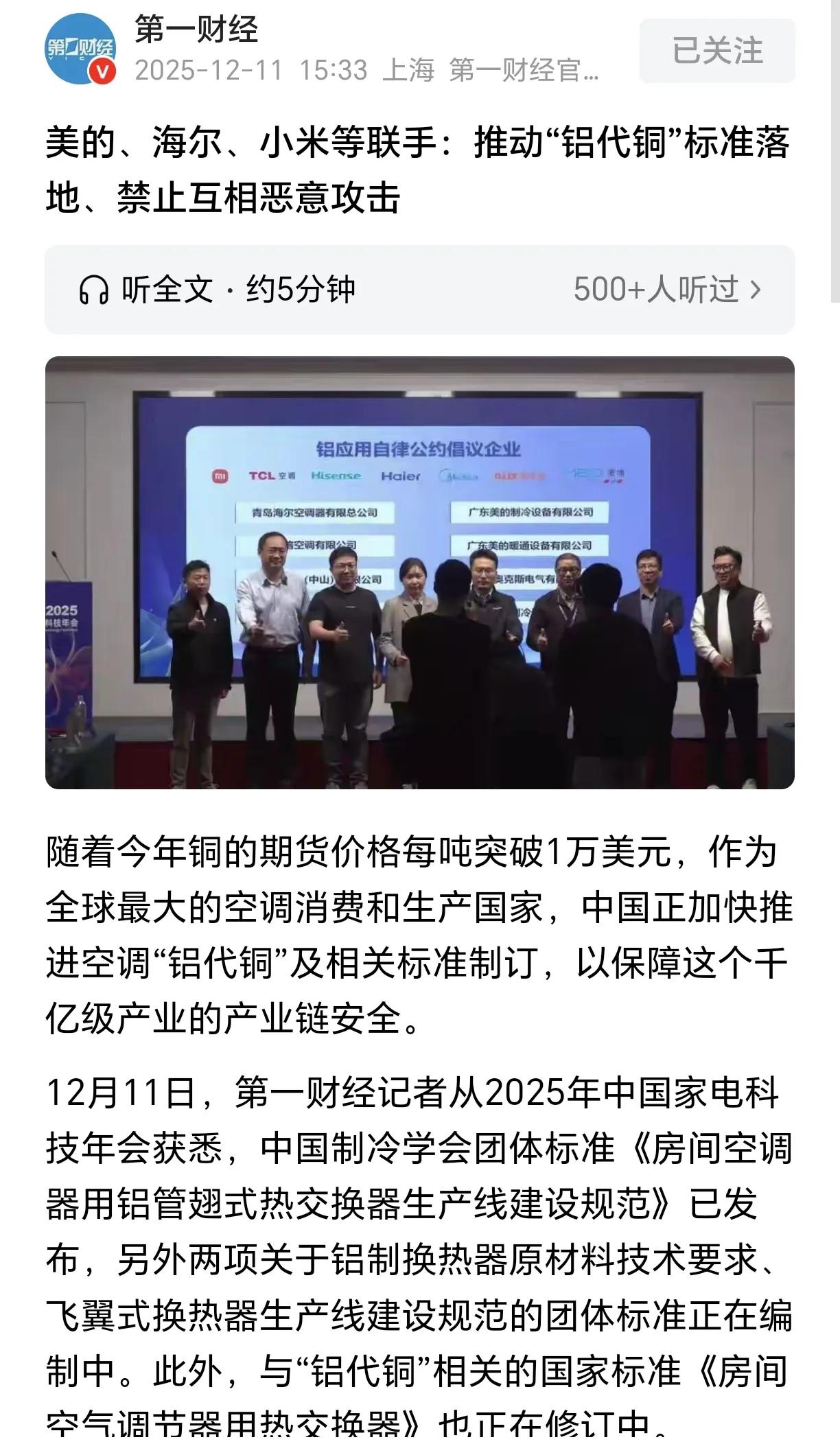空调厂家推行“以铝代铜”,是为了应对全球铜价上涨、降低成本。 如果技术达标、使用安全的话,那也无可厚非。 但还是想请各位空调厂商在以后卖空调时,能够在产品说明书上列举清楚空调哪些部位是铝制品而不是铜制品。 铝代铜技术