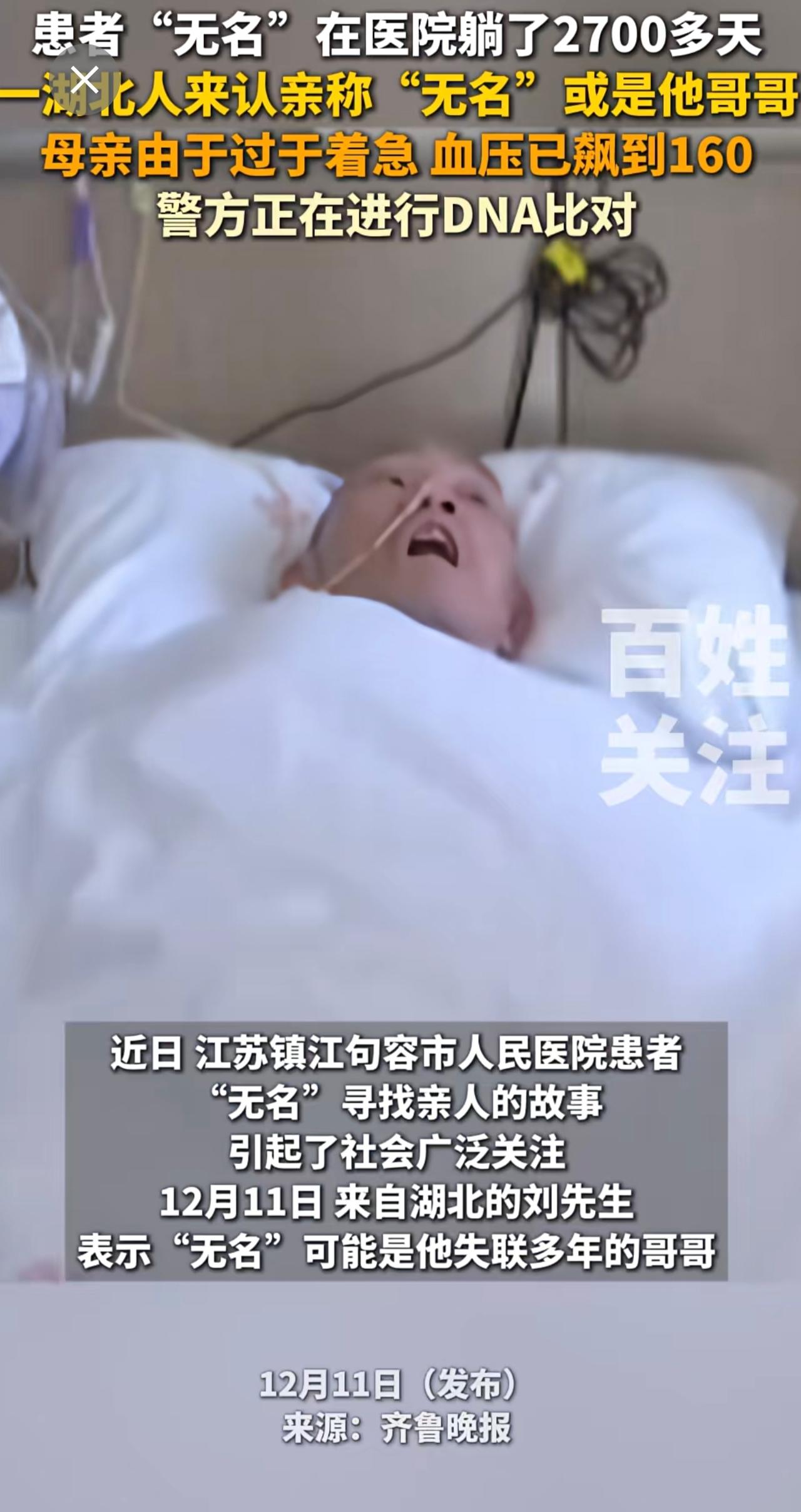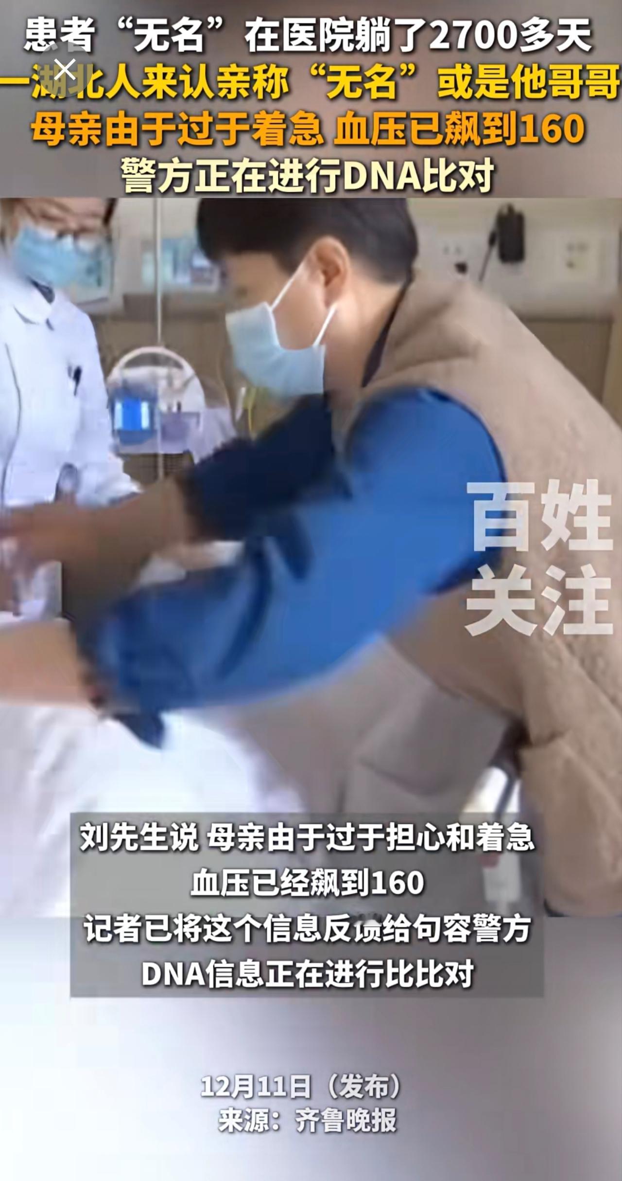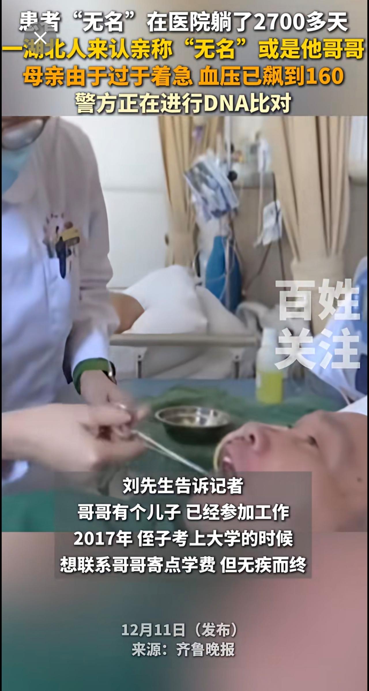 患者“无名”在医院躺了2700多天,一湖北人来认亲称“无名”或是他哥哥,警方正在进行DNA比对。
