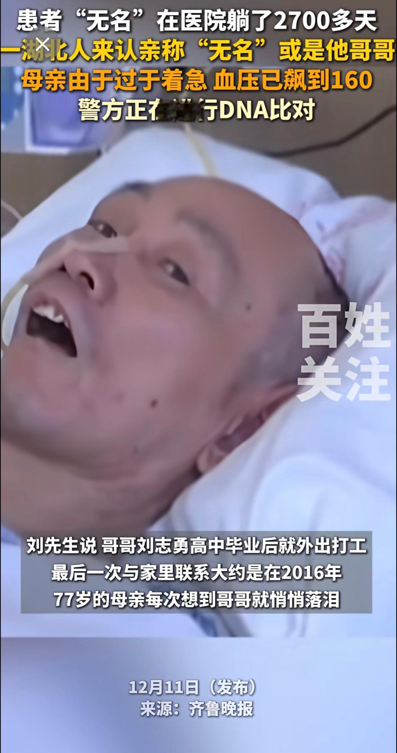 患者“无名”在医院躺了2700多天,一湖北人来认亲称“无名”或是他哥哥,警方正在