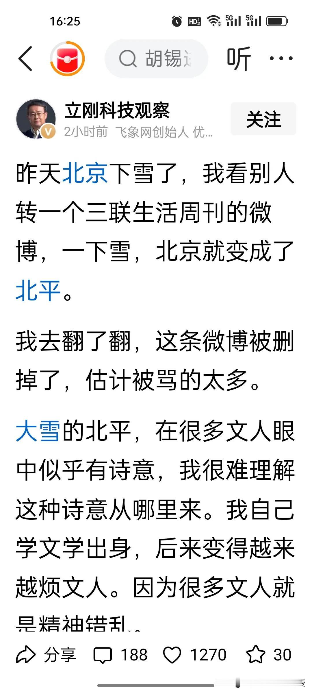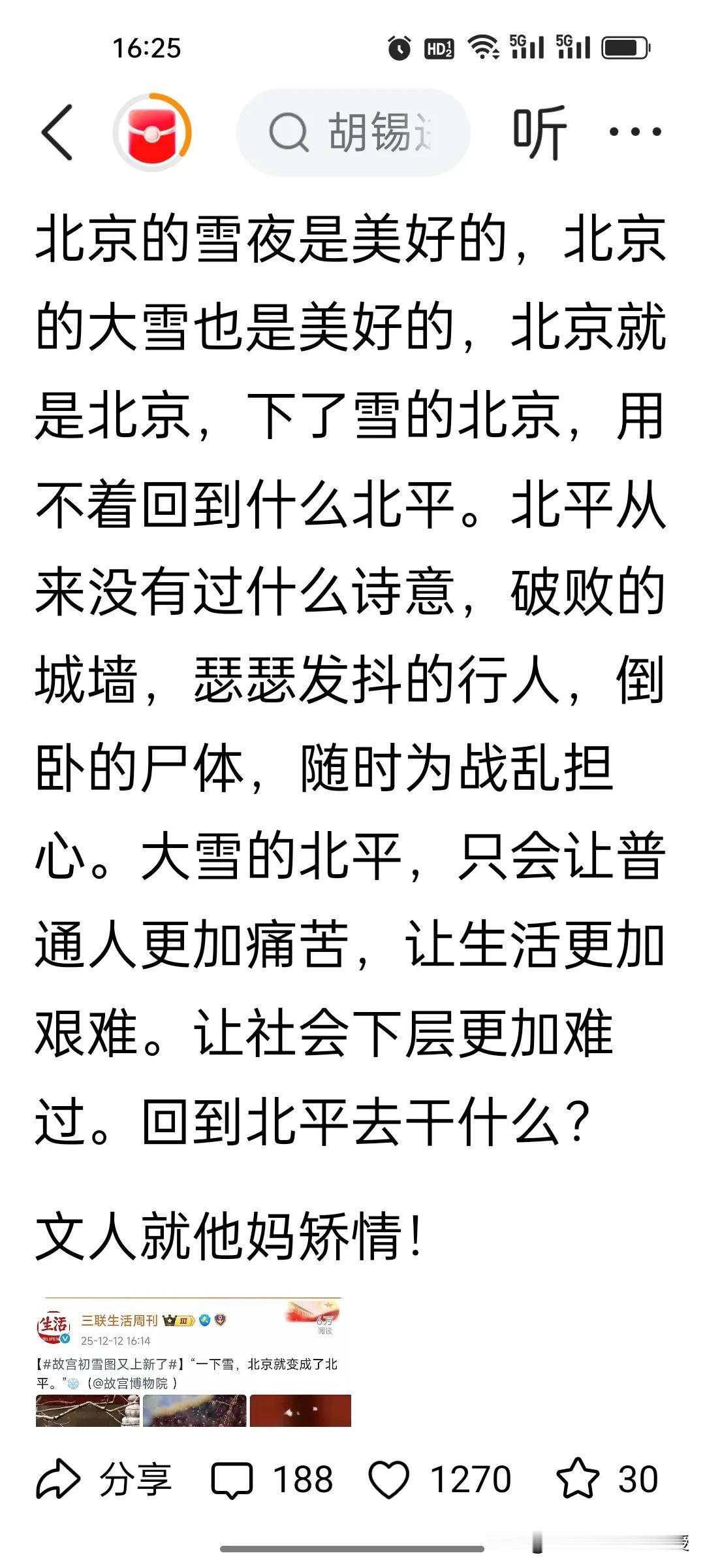 全网都在议论《三联生活周刊》关于北京下雪的这番评论“一下雪,北京就成了北平”,现在这句话已经被网友吐槽得删掉了! 项立刚更是说了一句“文人就是矫情”的话加以评价。他认为北京就是北京,不要说回到了北平,那个年代下雪就会冻死很多流浪汉,祥子在下雪天也要拉车,北平没有诗意,大雪的北平只会让人们生活更艰难。 其实《三联生活周刊》写下这句话,只是想借“北平”这个承载着古都记忆的旧称,对城市历史肌理与当下雪景美学的共情式表达,而非对过往生活的美化,这也是延续了这个周刊已经成立30年来的风格。 不过说实话,确实有点“老登”的文艺范,要与这届00后读者共情,应该与时俱进了。