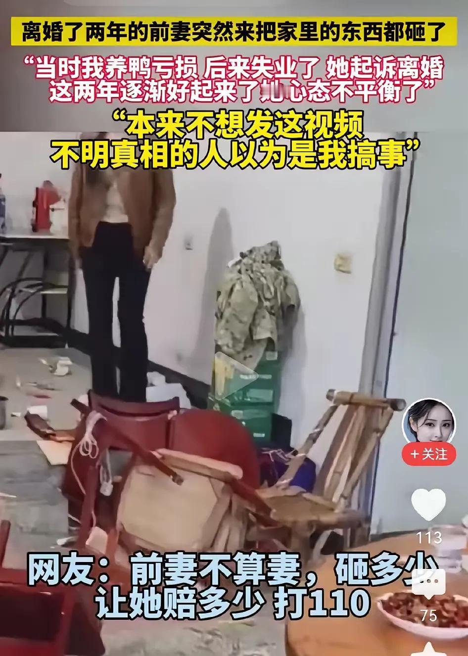 离婚两年的前妻,又跑到男子家里来闹事,把家里砸了个稀巴烂……她之所以跑到男子家里来闹事,是因为她心里不平衡,看到男子现在事业越来越好了,她心里又不舒服了。当年,她提出离婚,因为男子那个时候搞养殖创业失败了,她不想跟男人过苦日子,所以,强烈要求离婚了。 男子回忆起那段日子,养鸭场里的鸭子大批生病,投进去的积蓄打了水漂,紧接着又丢了工作,家里的日子一下子跌到了谷底。前妻没跟他商量半句,直接递上了离婚起诉书,那时候的她,眼里满是对贫穷的嫌弃,仿佛跟着他就只能过苦日子。男子没挽留,他知道人心散了,留着也没用,咬着牙签了字,独自扛下了所有的债务和失意。 这两年男子是真的拼,白天打零工,晚上琢磨小生意,一点点把烂摊子收拾好,日子刚有起色,前妻却突然冒了出来。她看着男子家里添置的新物件,看着他脸上不再愁眉苦脸,心里的嫉妒就像野草一样疯长,二话不说就动手砸东西,好好的家瞬间变得一片狼藉。男子站在一旁,心里又气又寒,他想不通,就算夫妻情分尽了,何至于做到这个地步? 其实这事里最让人膈应的,就是前妻这种“只能共富贵,不能共患难”的心态。婚姻本是两个人搭伙过日子,顺境时一起笑,逆境时该一起扛,可她在男人最难的时候选择抽身离开,看人家日子好了又想搅和,这不仅是不讲情分,更是没拎清自己的位置。 男子说本来不想发视频,怕不明真相的人误会他,这份顾虑也能看出他的无奈。毕竟外人只看表面,谁会知道这背后藏着这么一段凉薄的过往。 婚姻里的选择,本就该是心甘情愿的,选了离开就别回头眼红,选了相守就别轻易放手。前妻这样的做法,既丢了体面,又犯了规矩,实在是得不偿失。 各位读者你们怎么看?欢迎在评论区讨论。