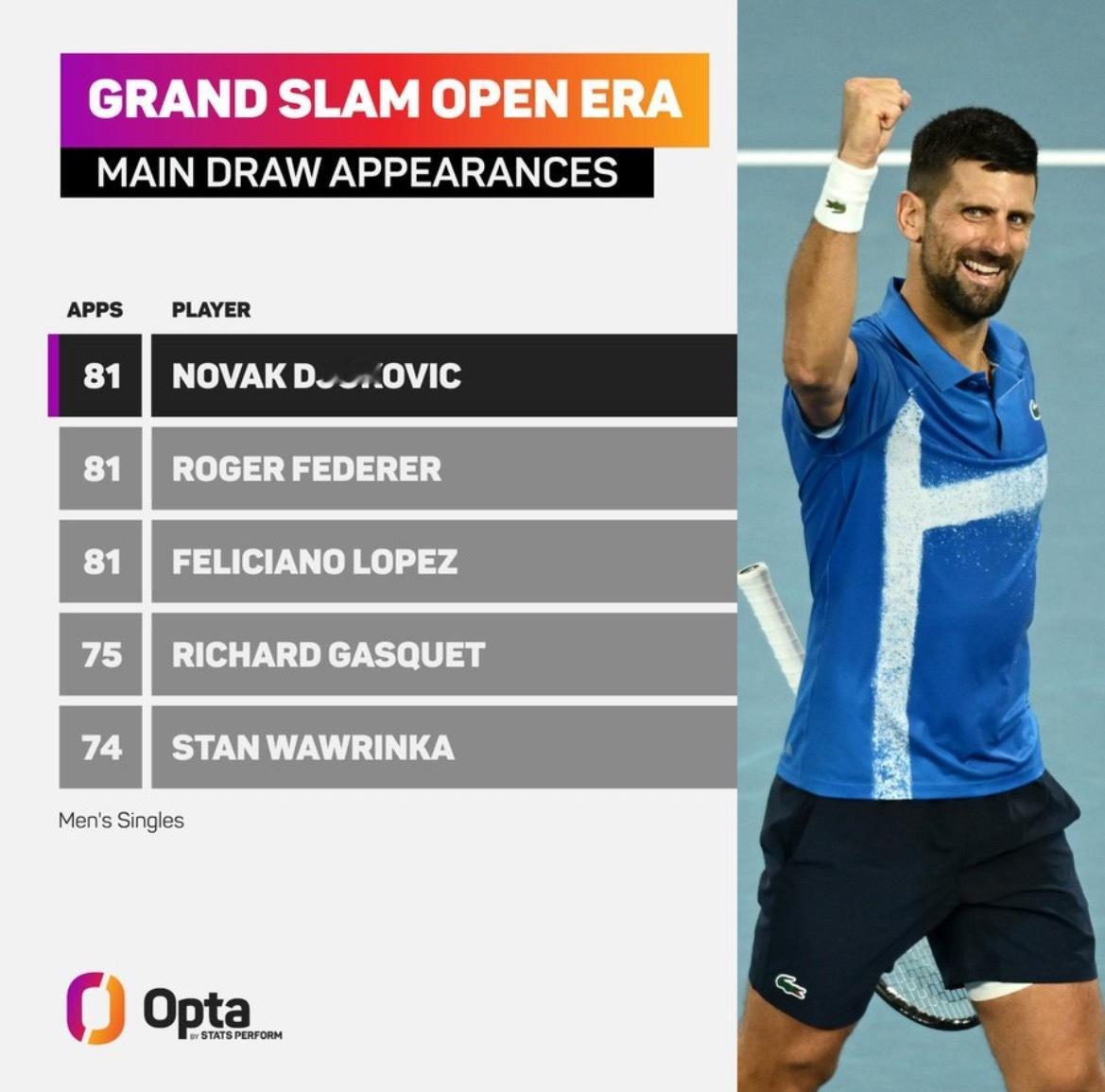 网球talking大会 81——诺瓦克·德约科维奇将在2026年澳大利亚网球公开赛上迎来他的第81次大满贯赛事亮相,追平罗杰·费德勒和F·洛佩兹保持的公开赛时代男子单打大满贯参赛次数最多的纪录。职业生涯的持久力!