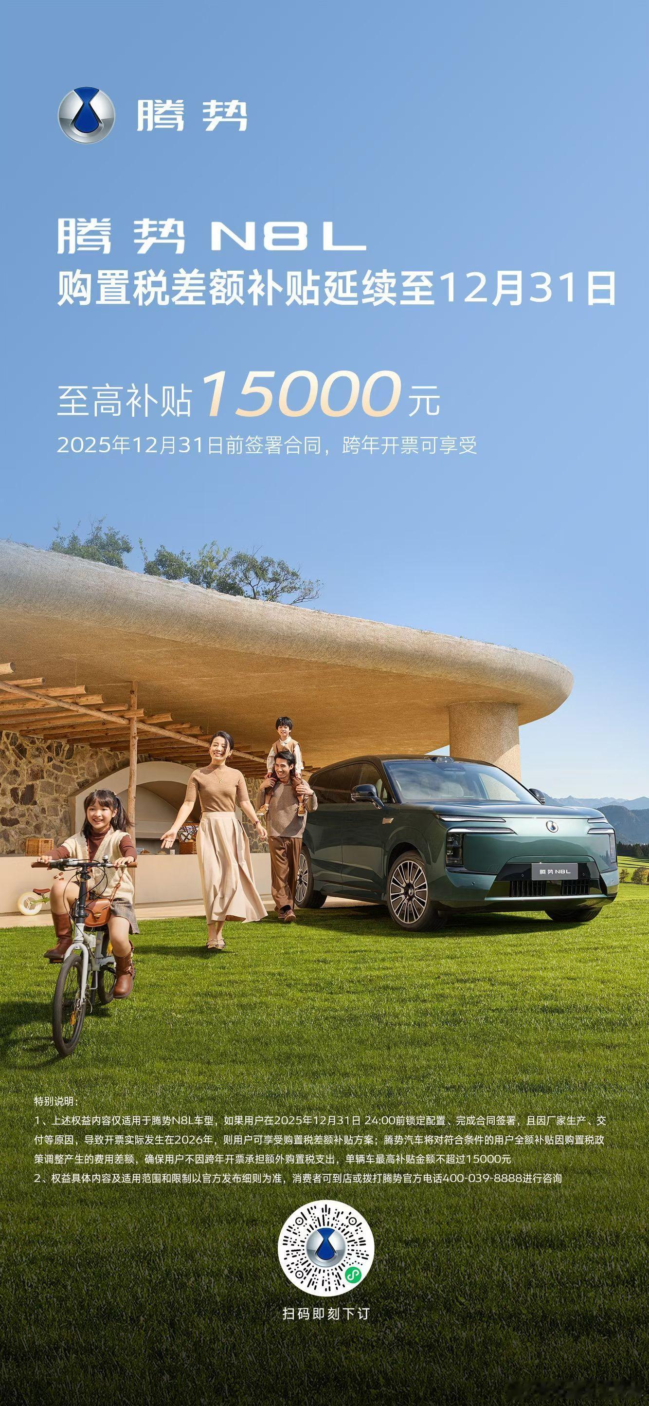 年底购车福利加码,腾势N8L购置税差额补贴兜底延至12月31日,至高1.5万元……也算跟进了政策腾势N8L最后一个月冲一把大的,看看能到多少
