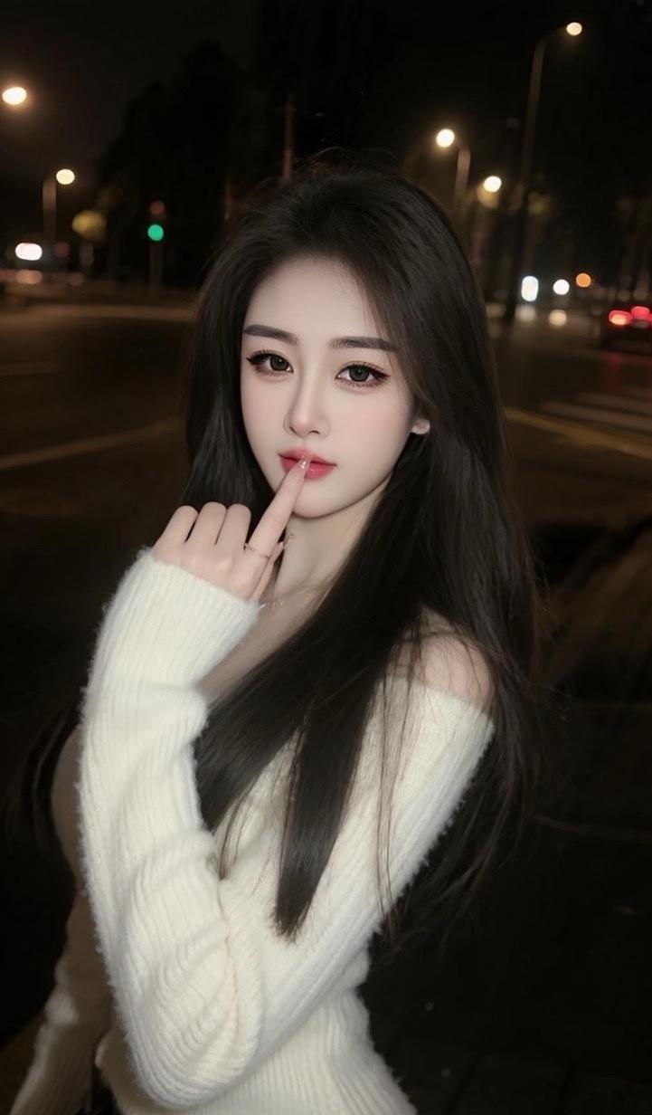 夜晚街头的温柔少女,指尖轻触唇边,散发着神秘与优雅的气息。