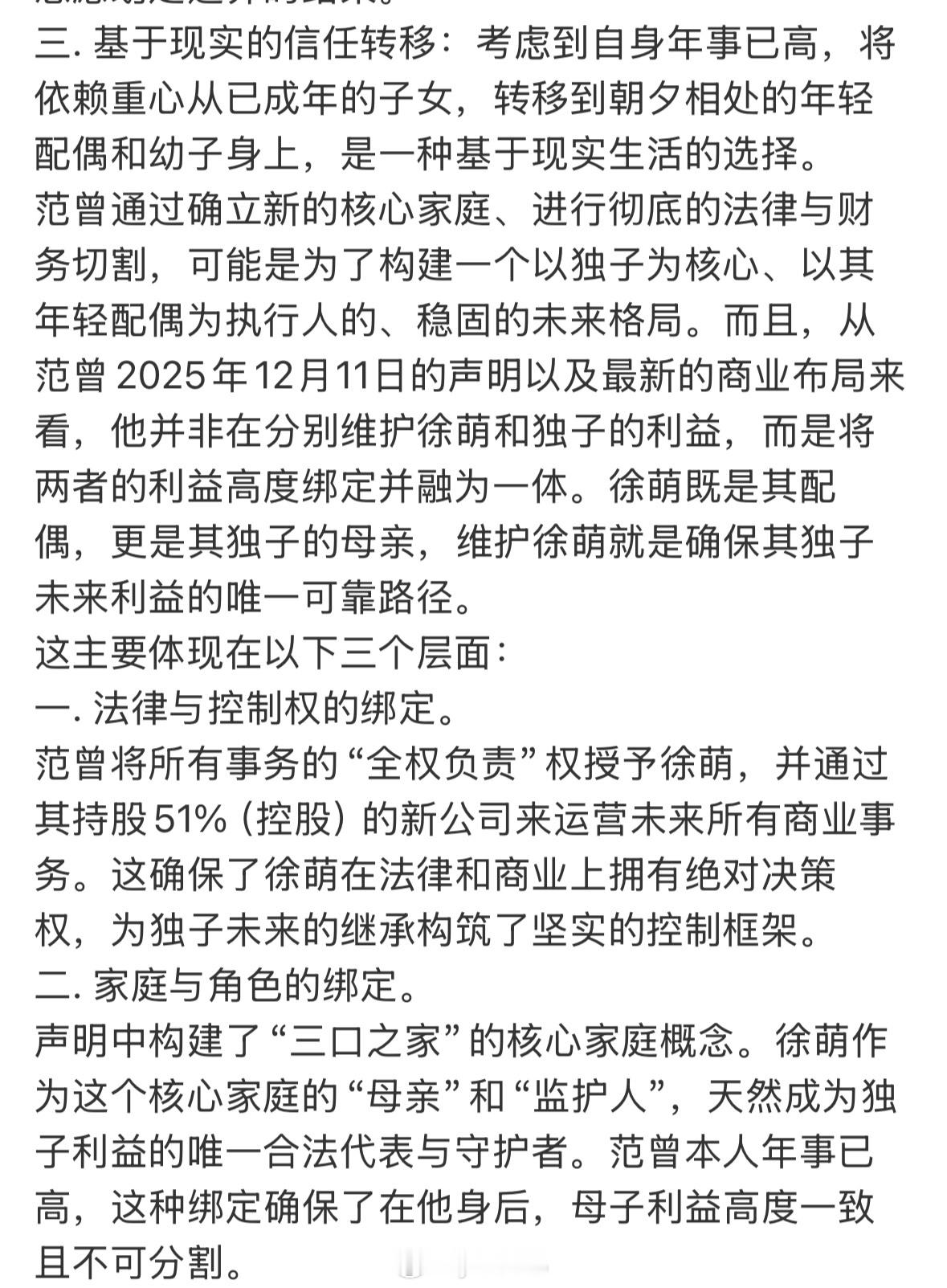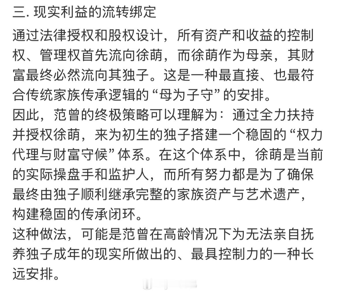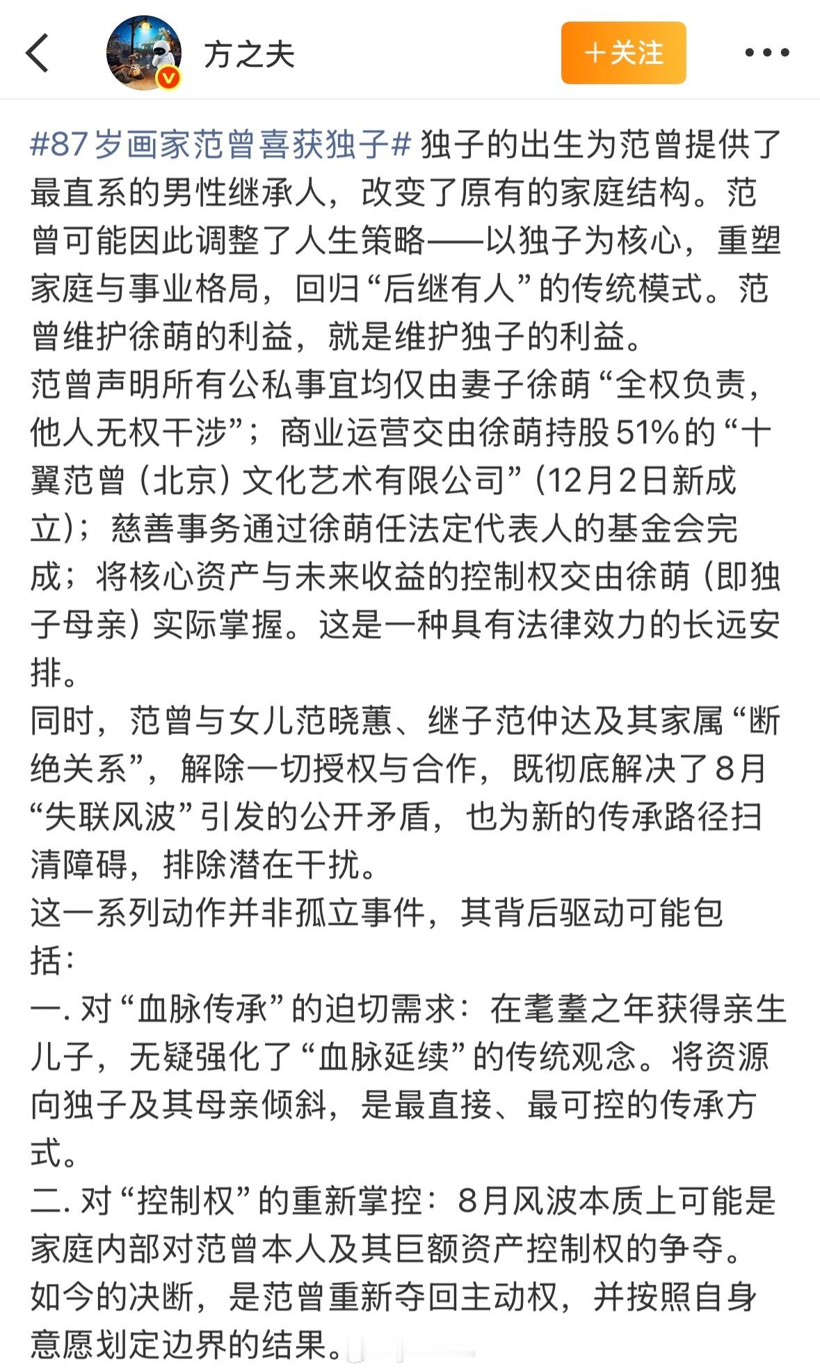 有财经领域的人分析了范曾的声明,说他的策略是通过全力维护妻子徐萌和孩子的利益,来为刚出生的孩子搭建一个稳固的权力代理与财富守候体系。挺有远见的,在尽全力为家庭和孩子做长远安排,也算是当父母的良苦用心了。