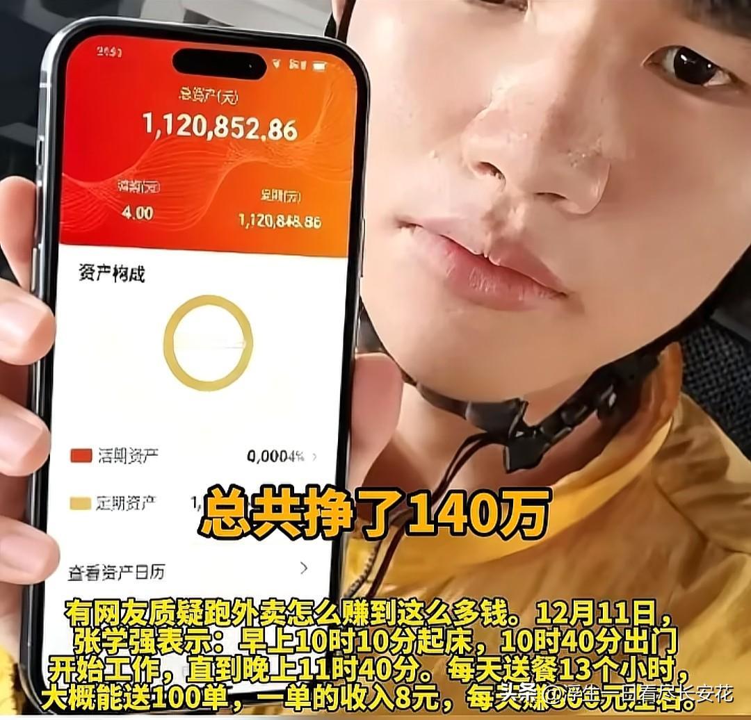 跑外卖跑的这么狠,怎么人还白白净净的?大家信他吗?最近有个外卖员跑外卖5年挣了140万,这是当下外卖员跑十年都未必能挣到的数字,他却白白胖胖干干净净的把钱挣到了,网上很多单王都是黑黢黢的,一脸憔悴,而他却还有激情准备创业开早餐店,话说跑外卖这么挣钱,还开什么早餐店?即便开家早餐店,就不怕五年全白干吗? 而且5年要存到140万,每天要挣到七八百才行,平时还得省吃俭用,不能有别的开支,节假日也不能休息,如果是真的,几乎很难有人挣到这么多钱。不过笔者质疑的是,像他这么拼命送外卖的“单王”,平时风里来雨里去,为什么一点影子都没有,连同行都没有站出来为其发声,人是一下子跳出来的,这可信度高吗?