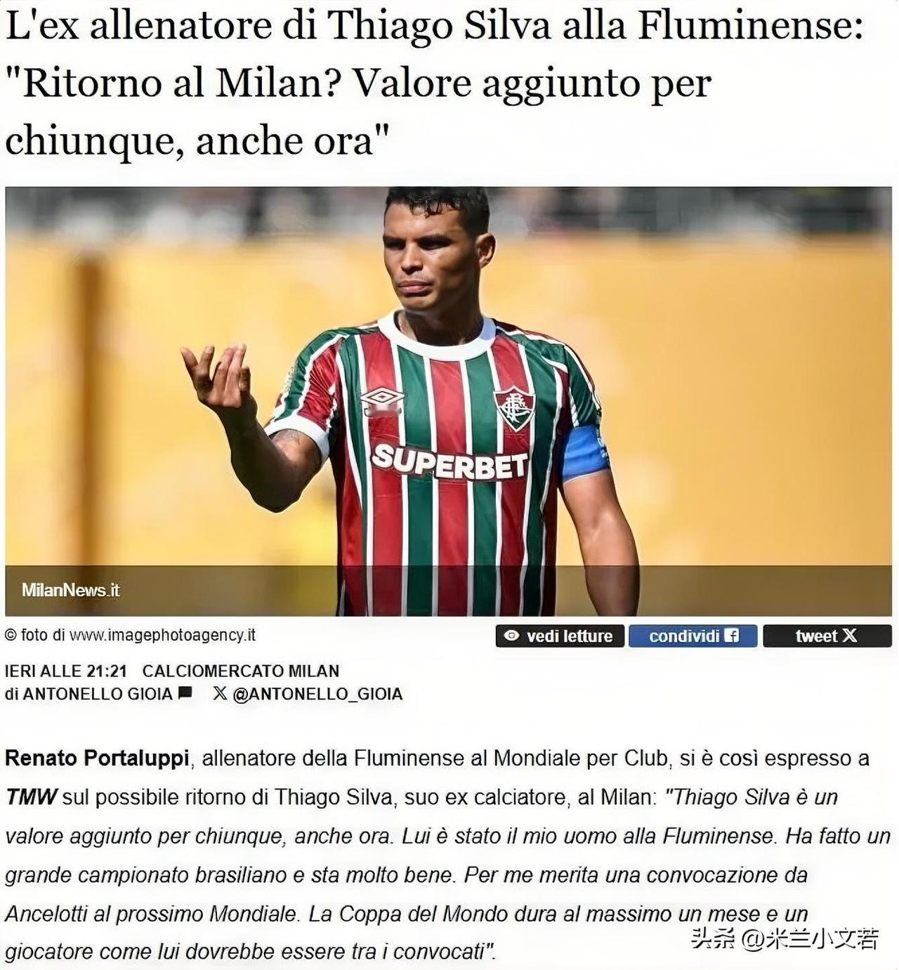 蒂亚戈·席尔瓦!迪亚哥席尔瓦无论加盟哪支球队对于球队而言都是非常重要的补充。关于蒂亚戈·席尔瓦回归米兰的传闻,蒂亚戈·席尔瓦前主教练接受采访表示,蒂亚戈·席尔瓦如果加盟米兰他就能成为米兰后防线的重要球员。 蒂亚戈·席尔瓦依然出色,本赛季在巴西联赛表他还是定海神针的存在,巴西联赛并不落后于欧洲,他在巴西联赛表现出现出了良好的状态,相信他可以把这样的状态延续到欧洲任何一家俱乐部,无论加盟哪一支球队,席尔瓦都是不可或缺的球员,我不清楚蒂亚戈·席尔瓦的想法,但他一直都是米兰球迷,心中一直都有红黑军团,如果他能回到米兰相信对蒂亚戈·席尔瓦而言是一个梦想成真的过程。 同时他也喊话了巴西国家队主教练安切洛蒂,他说蒂亚戈·席尔瓦完全配得上被安切洛蒂召入明年的世界杯参赛阵容。世界杯最长也就持续一个月时间,像蒂亚戈·席尔瓦这样的球员应该入选名单。如果蒂亚戈·席尔瓦真的能回归米兰,估计安切洛蒂会关注蒂亚戈·席尔瓦的表现,毕竟作为米兰球迷,安切洛蒂会观看米兰每场比赛。