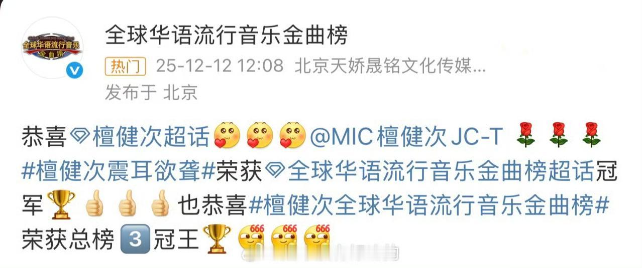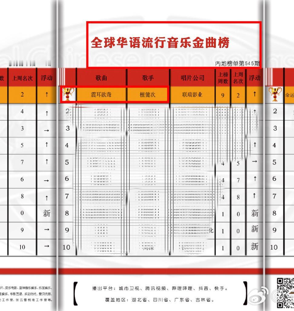 恭喜檀健次《震耳欲聋》荣获「全球华语流行音乐金曲榜」内地榜单第545期冠军! 今年他的几首OST都太好听!《画像》奇峰嶙峋,《孤》波澜壮阔,《震耳欲聋》直击人心,最新的《get to it》慵懒随性,三公主不知道今年能不能出,太让人期待了,他真的不断在进步,强的可怕! 每首都觉得好听到无出其右,没法想象下一次还能有多好,但听到下一曲,居然还是极具冲击力的好! 而且这几首都是旋律复杂,音域跨度极大,演唱难度很高的作品。檀健次的唱功非常厉害,这么难唱的歌从他嘴里出来并无任何费力感,他技巧很强但不会给人刻意炫技的感觉,技巧非常丝滑地隐藏在情感后面。 他在北影节上唱《 在故事的最终 》如春风化雨,有一股温暖向上的力量,我也很喜欢。还有《那些荧火》,温暖清新文艺,旋律特意编的简单了一点,方便大家合唱,我也很喜欢。 我还特别喜欢他翻唱的粤语歌,比如《当年情》《讲不出再见》《初恋》《夕阳醉了》《单车》……我有强烈的感觉三专会有粤语,祈祷祈祷!! 檀健次所有的歌曲中我最喜欢的三首歌手机铃声《等不到的等待》,闹钟《一念无明》,微信铃声《震耳欲聋》! 《震耳欲聋》单曲循环了两天,层层递进的情绪,略带沙哑的嗓音,“活出人样的我有错吗?”“活出人样的我有错啊!” 这两句唱的我特别有共鸣感。 看《 震耳欲聋》的时候,影院响起这首歌时瞬间鸡皮疙瘩,配合檀健次的炸裂演技和演唱,心里共鸣太深了,满满的故事感,还有那充满无奈,痛苦,挣扎的人生,每个人都有自己想到达的32楼,每个人都想为自己大声说话!32楼的执念啊! 每个人都有自己内心的“32楼”,都有自己曾经想活出的“人样”,可越努力,有时候却越面目全非,连自己都认不出自己,谁也不知道我们曾付出的代价是什么,也开始迷茫我当时的追求是“对”,是“错”,找回“自我”,才是我们内心最深的“呐喊”! 檀老师的唱功最近两年肉眼可见地越来越强,每隔一段都有惊喜,看不到他的上限在哪里! 唯一的缺点就是对于普通人来说,檀健次的歌曲难度都太大了。檀健次没有口水歌,每一首都不好唱,会稍稍影响他歌曲的传唱度,檀健次的唱功真的是被低估的。
