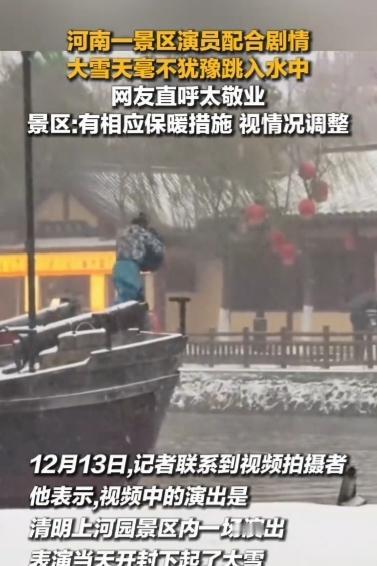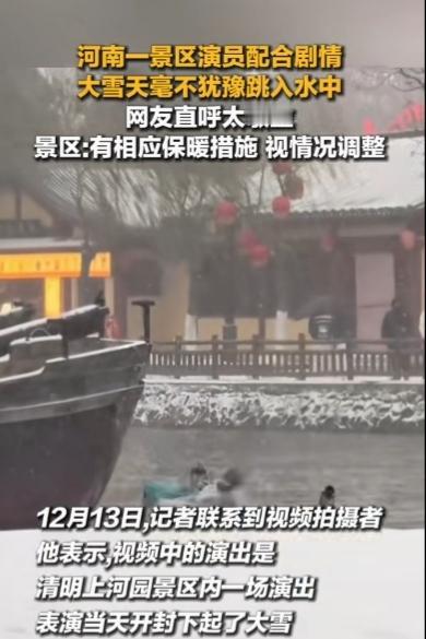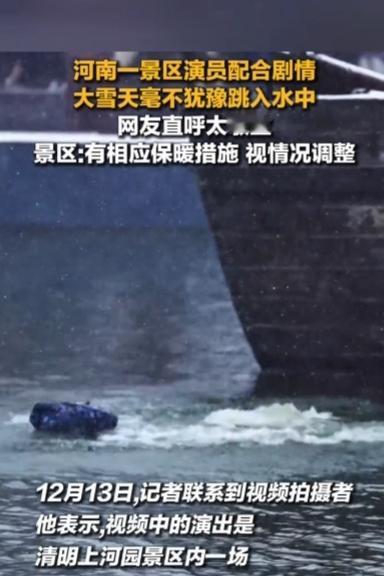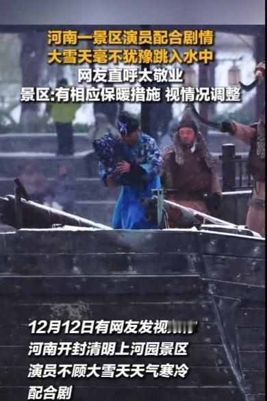 妈呀!清明上河园景区! 仅是为了给游客看戏! 让演员大雪天跳入水中! 还声称有保暖措施,水面结冰便取消…… 这是敬业么?! 这简直是拿生命健康开玩笑! 不是为了那碎银几两, 有谁会愿意大雪天跳水? 我说清明上河园的管理策划人员们, 不要死板!不要懒惰! 天冷了就不要表演“大宋东京保卫战了”! 换些其他戏不行么? 先不说游客喜不喜欢看这些表演, 这大雪大冬天的, 游客是人!演员也是人! 不要为了讨好游客而忽视演员们, 一个城市要有温度才能吸引更多的人。