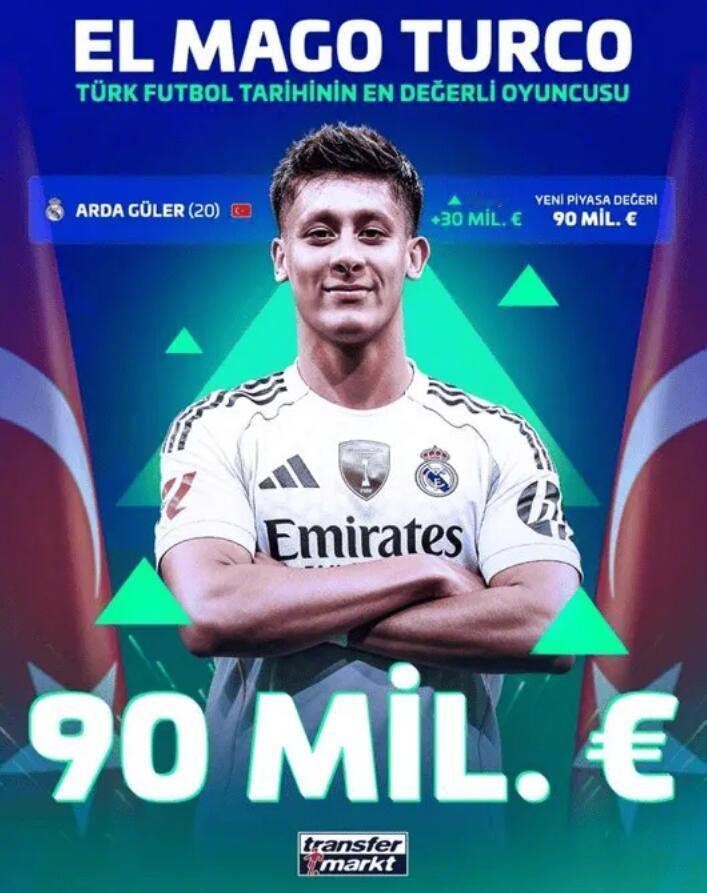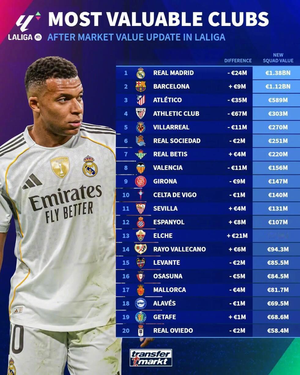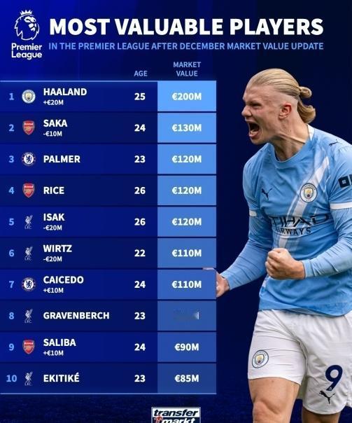 最新德转身价变化! ★足坛三骄时代! 哈兰德与姆巴佩身价双双暴涨2000万欧元,与亚马尔一样同为2亿欧元。 ★皇马球员的虚高身价! 20岁皇马中场居莱尔身价暴涨3000万欧,来到了9000万欧。这位土耳其新星的真实身价或许只有3000万,9000万堪称“天价泡沫”,德不配位啊! ★皇马中场贝林厄姆因状态下滑,身价下降2000万,但仍然还剩1.6亿,当然不排除后期还会继续下跌。 ★德转英超球员身价,利物浦多名球员大幅下跌。 ★曼城门将多纳鲁马身价上涨500万达到4500万欧,独享世界第一身价门将宝座。 ★英超球员身价排名! 哈兰德2亿居首,伊萨克降至1.2亿,维尔茨降至1.1亿,各降两千万,萨卡也降了一千万。 ★纹丝不动! 贝蒂斯的安东尼身价还是3000万欧元,本赛季他16场8球4助攻,可惜仍然无法让人信服。 ★西甲俱乐部总身价排名! 皇马还是第一,但总身价数额下降了。