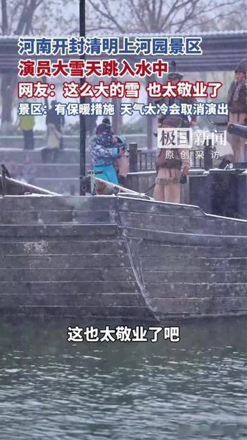 开封的雪都埋到鞋跟了,我举着热奶茶逛清明上河园,突然看见穿青衫的演员往汴河里跳, 你第一反应是不是这也太拼了?我当时攥着奶茶的手都紧了,直到看见岸边举着姜茶的工作人员,还有演员上岸就裹着羽绒服往暖房跑。 后来才知道,水下铺了恒温加热管,戏服里贴了5片暖宝宝,结束有红外暖灯房,低于-5℃直接取消,今天刚到-3℃才敢演。 有人说这才是真守艺,并非为了博眼球才冻得发抖,是景区把“人”放在“戏”前面,演员把“游客的宋梦”放在“自己的冷”前面。雪天里的跳水,跳的是北宋烟火,暖的是咱们对“用心”的那点共鸣。 你们最近遇到过这种“暖到心里”的敬业吗?是保安冒雪帮你搬快递,还是早餐摊阿姨多给你加了勺热粥?大家怎么看?