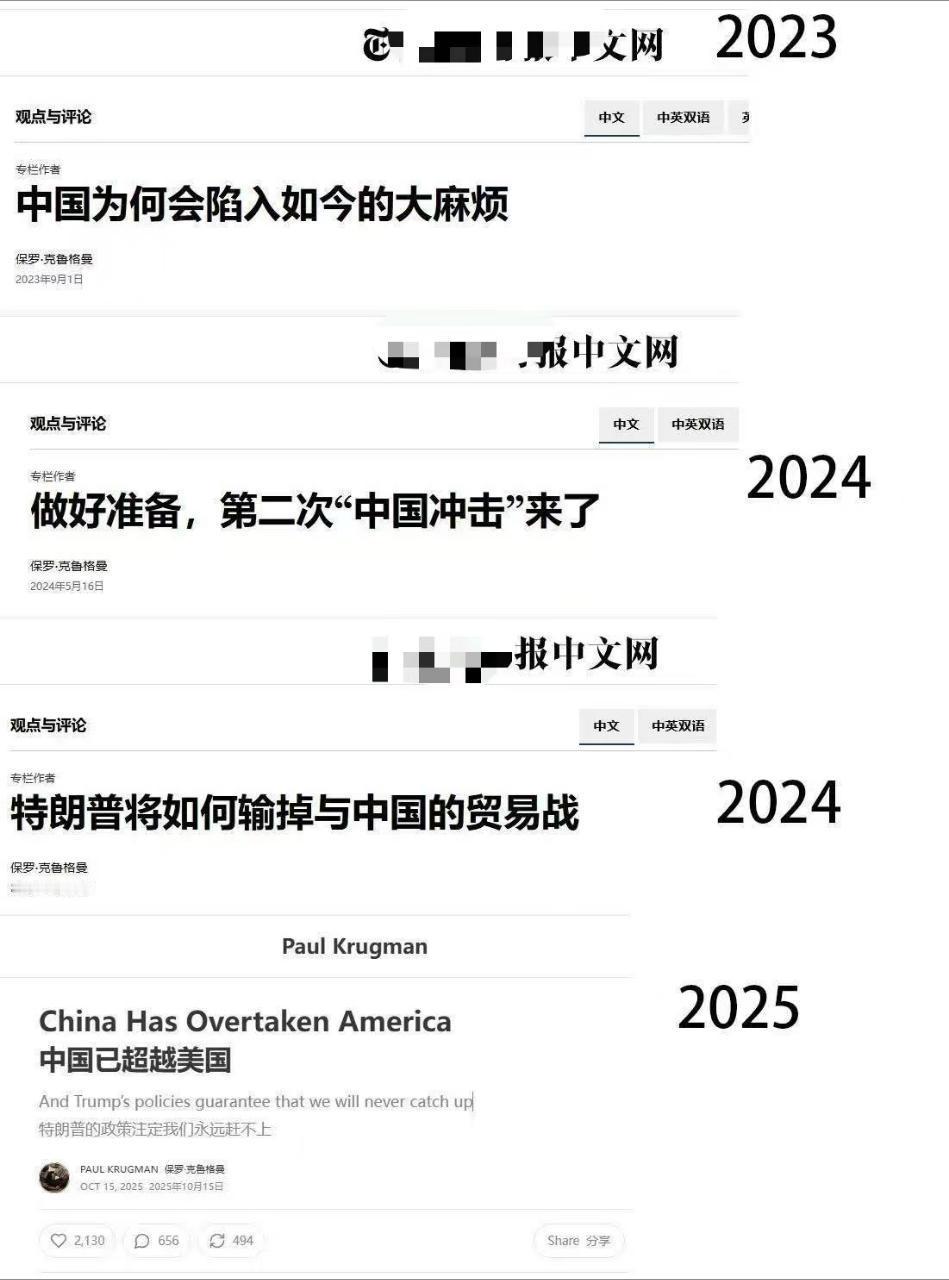 2013:中国模式遇到大麻烦了2015:五年内中国经济遇上大麻烦2016:中国困境会引发全球危机吗?2023:中国为何会陷入如今的大麻烦2024:做好准备,第二次中国冲击来了2024:特朗普将如何输掉与中国的贸易战2025:中国已超越美国——诺贝尔经济学奖得主、战忽局国际友人 克鲁格曼