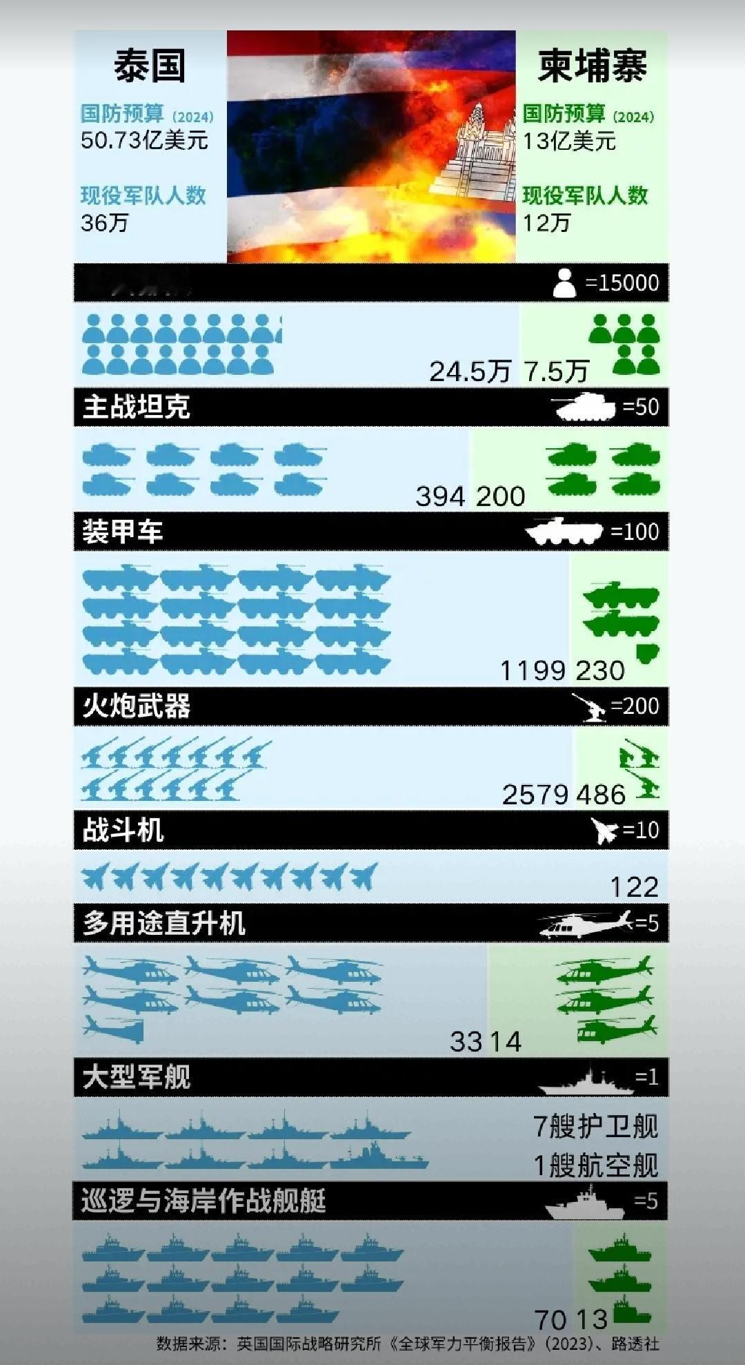 看了泰国和柬埔寨的军事儿对比图,我觉得柬埔寨还是乖乖发一个声明“严打黄赌毒,电诈,人口贩卖”。尤其是针对警察队伍大刀阔斧的反腐。 泰国之所以受不了柬埔寨,除了土地上边界争端和佩通坦录音门事件,最重要的是旅游业遭受巨大冲击! 柬埔寨的电诈网赌园区臭名昭著,已经让人泛化的联想到,只要去东南亚旅游,都不安全,都可能被卖或者被骗到柬埔寨园区。 至少我身边亲友都有这方面客观存在的担忧! 因此,在泰国绝对的实力面前,柬埔寨应该下定决心用铁腕铲除电诈! 泰国柬埔寨冲突 泰国柬埔寨局势